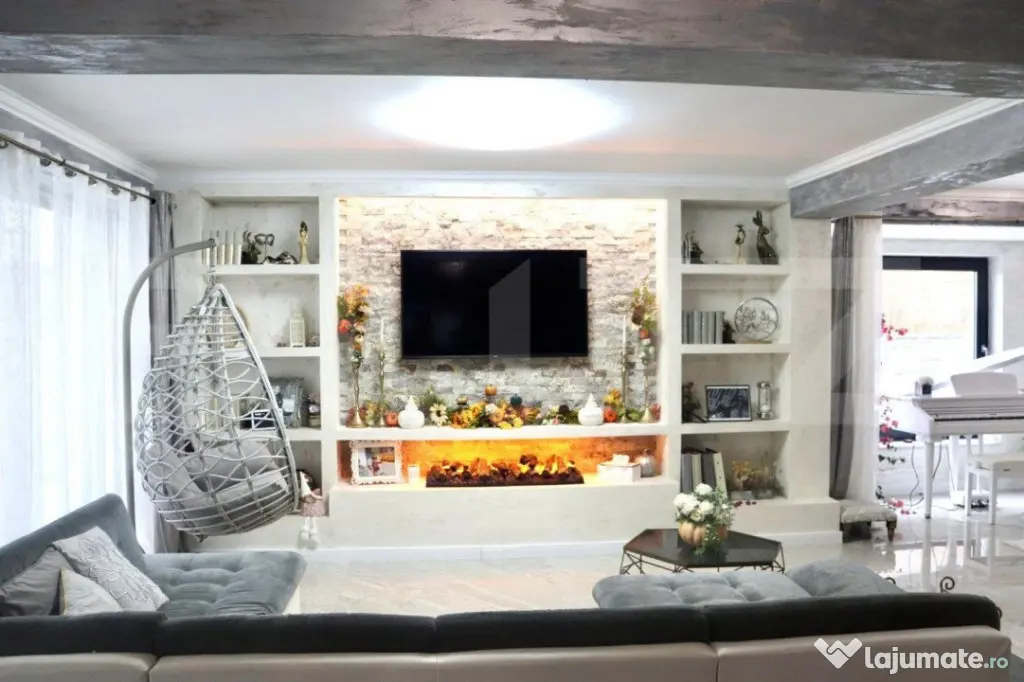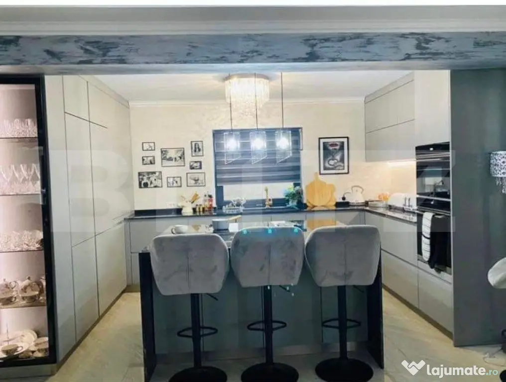 - Living de 50 mp + bucatarie open space, +10mp, cu urmatoarele: masa de 2 m din marmura gri, cu 8 scaune, semineu electric optymist Dimplex, cu doua rezervoare, canapea extensibila cu lada, 350cm, Grand Piano electric, TV LG, 140 cm diagonala. La Bucatarie avem: mobila MDF, ultra mat cu blat de granit de 2 cm, insula de 165x140cm, imbracata in granit de 2 cm, 4 scaune de bar, 2 frigidere incorporate(cu congelator), cuptor cu microunde cu grill(40L), cuptor de gatit, plita cu 5 ochiuri(de 90 cm), hota incorporata in blatul insulei(de 90cm), chiuveta de granit de 80 cm(Grohe), masina de spalat vase incorporata(full size).