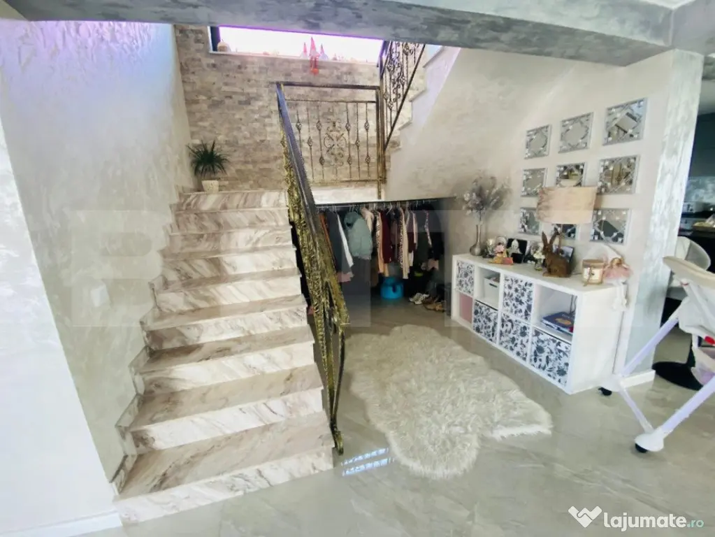 Etaj: Scara spre parter este imbracata in marmura de 2 cm, Hol de 3x2m, cu intrare in pod, in baie si in cele trei dormitoare, care sunt in urmatorul fel: 1 dormitor matrimonial cu baie proprie si dressing, cu intrare separata printr-un hol, dormitor 2(cu dressing) si dormitor 3, toate foarte spatioase.