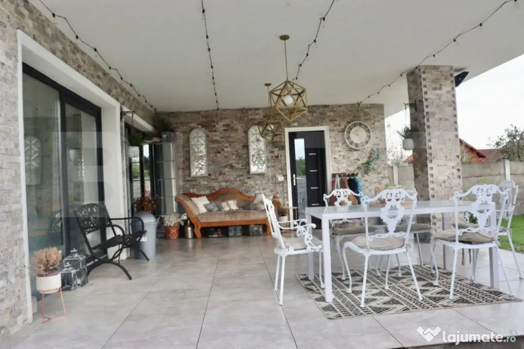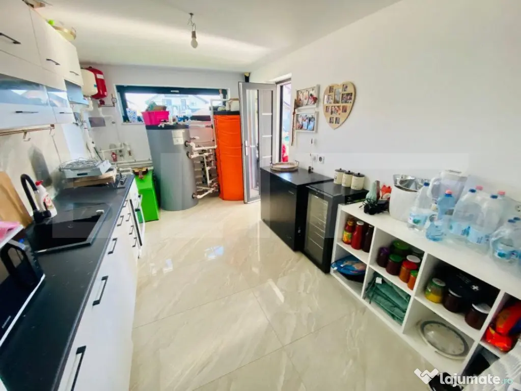 -loc de depozitare sub casa scarii care este lata de 3 m, terasa acoperita, de 40mp imbracata in piatra naturala si pardoseala din gresie, bucatarie de vara care este dotata cu toate utilitatile, plus uscator si masina de spalat haine.