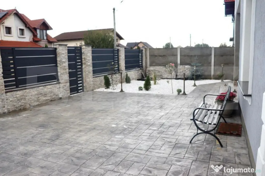 Terenul si curtea imobilului este desfasurat si amenajat astfel: In partea din fata a casei avem partial beton amprentat, piatra alba, copacei tuia, gardul dinspre strada este placat cu piatra naturala, glafurile si capacele sunt din granit de 2 cm, poarta este din aluminiu, cu deschidere automatizata si in fata casei avem beton, pe care se pot parca 3 masini.