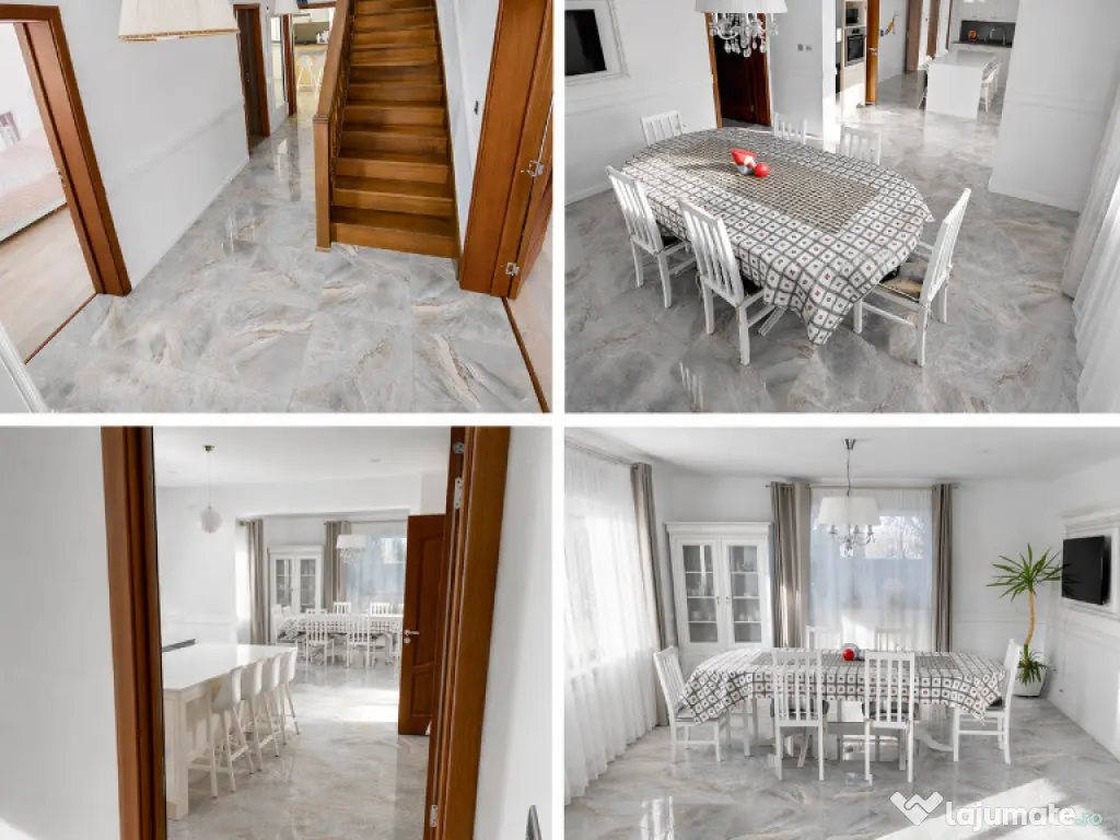 Parter: living, cameră de oaspeți birou, baie, bucătărie cu dining, cămară, spălătorie și spațiu pentru spalare și uscare rufe.