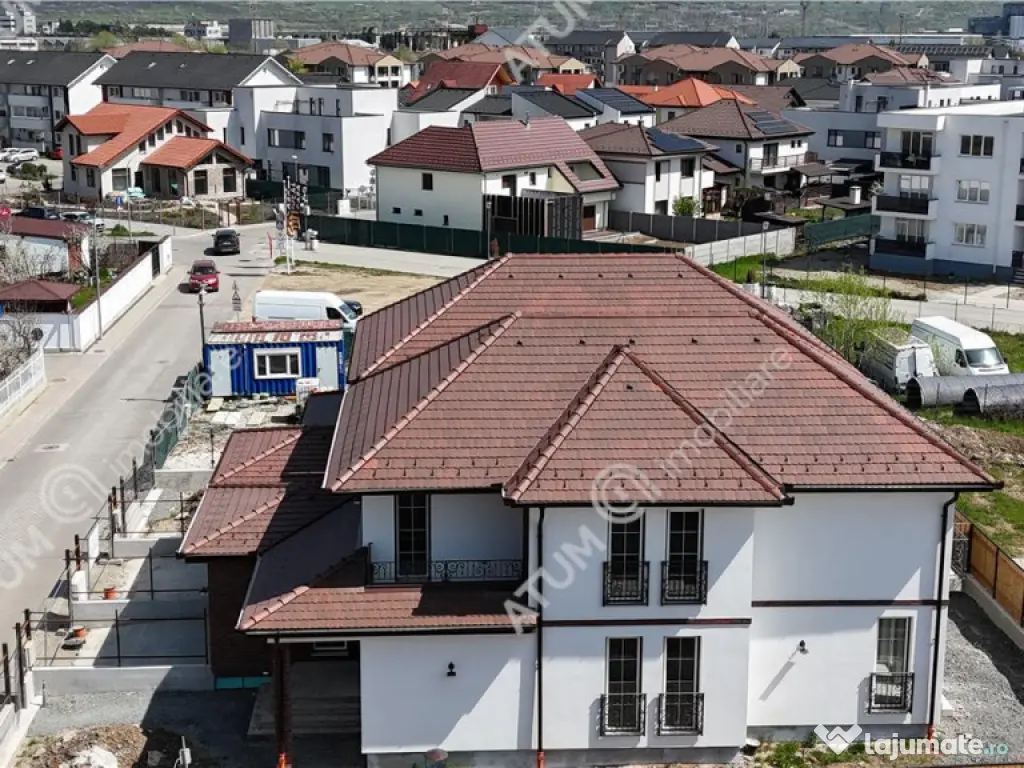 Casa este construita din caramida Porotherm Robust, cu ziduri exterioare de 30 cm si interioare de 25 cm, izolatie exterioara din polistiren EPS 200 de 10 cm, decorativa marca STO si caramida decorativa de exterior Klinker. Acoperisul este realizat cu tigla Bramac Reviva si folie anticondens, iar lemnaria din pod este supradimensionata si ignifugata si sistem pluvial marca Bramac racordat la sistemul pluvial stradal . Placa peste parter supradimensionata pentru izolatie fonica, iar placarile tavanului de la etaj sunt cu rigips ignifug, izolat cu vata bazaltica si folie aluminizata lipita perimetral cu banda de etansare, usa de acces pod este termoizolanta cu vata si folie eluminitata.Tamplaria este de aluminiu cu bariera termica, realizata la comanda in doua culori, cu trei foi de sticla si baghete albe, importate din Ungaria. Garajul este pavat cu gresie speciala pentru trafic auto, usa actionata electric marca Hormann, priza pentru incarcare masina electrica si curent trifazic. Centrala termica este Vailant, cu boiler inclus, iar incalzirea in pardoseala este distribuita separat pe fiecare nivel, cu termostate individuale pentru fiecare incapere. Casa dispune de instalatie pentru aer conditionat, sistem audio 4.1 pregatit in living, tablouri electrice separate pentru parter si etaj cu sigurante pentru consumatorii de putere, prize si intrerupatoare montate.