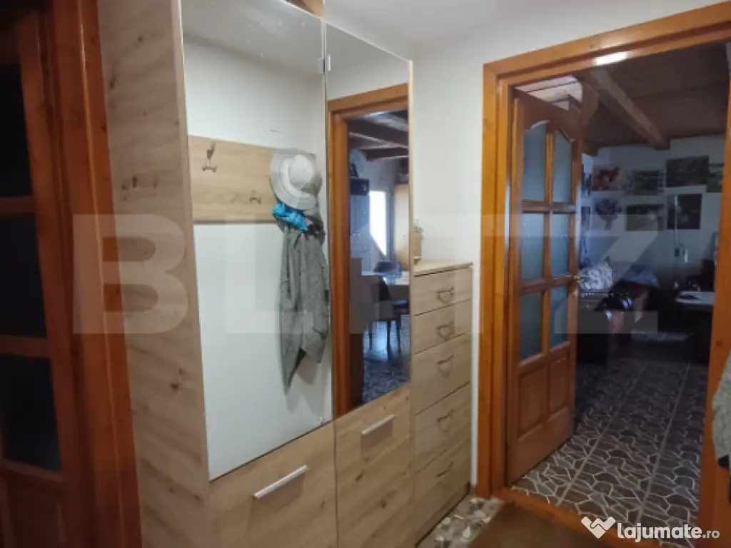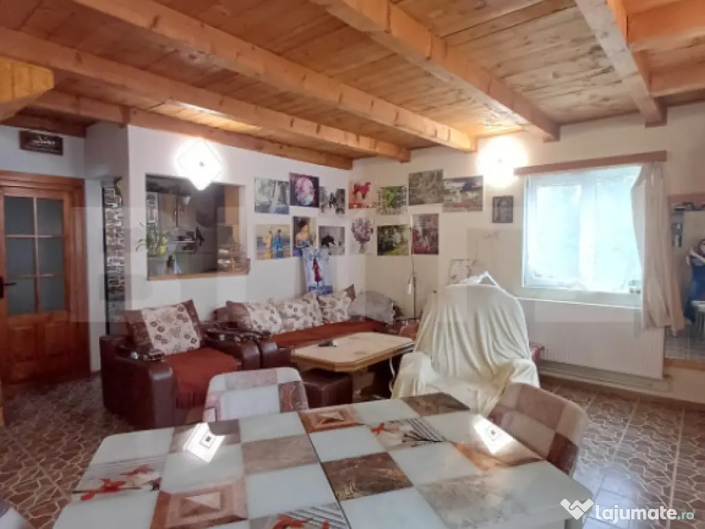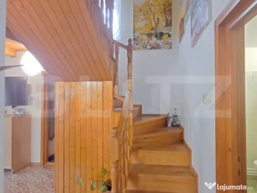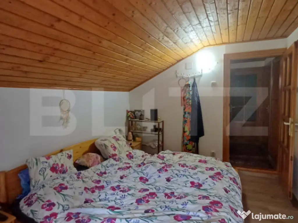 Blitz va ofera spre vanzare o proprietate formata din casa 120 mp utili si teren pe o suprafata de 2800 mp. Casa este construita pe regim P+M si este compartimentată astfel: parter, living cu bucatarie, birou si baie. Tot la parter avem si camera tehnica si camafra cu coborare in beci de circa 8 mp. La mansarda avem 3 dormitoare si un deressing care poate fi transformat in baie. Doua camere au iesire pe balcon. La parter avem o terasa de circa 17 mp acoperita cu lambriu si tabla. Exista si o bucatarie de vara cu cuptor de paine, gril, soba cizma, aragaz si chiuveta cu apa curenta rece si calda. Ca si anexe avem doua magazii, din care una pentru depozitat lemne si un atelier. Casa este construita pe fundatie din beton armat si structura de lemn. Este izolata pe interior cu vata minerala si placata cu rigips. Acoperisul este din tigla, izolat cu vata minerala. Podul este de asemenea izolat cu vata si podit cu scandura. Utilitati: fosa septica, curent, apa din panza freatica cu hidrofor, incalzirea cu calorifere cu cazan pe lemne, pufer automatizare, boiler pentru apa calda cu dubla sursa de incalzire, pe lemne si electric. Intrarea in curte se face pe o alee privata care apartine de proprietate. Este pavata partial, pe restul terenului fiind gazon si livada cu pomi fructiferi. Gradina cu flori si zona de relax. Casa este dotata cu sistem de supraveghere video, internet, poarta pe sina cu automatizare electrica. Proprietatea este imprejmiuta cu gard de plasa cu stalpi metalici incastrati in beton. Aceasta proprietate se afla într-o zonă superbă in continua dezvoltare cu posibilitatea de transformare în pensiune turistică. Pentru detalii suplimentare si organizarea unei eventuale vizionari va asteptam sa ne contactati! Cod ofertă / ID BLITZ: P151481 Id intern: P151481 Număr niveluri imobil: 1 Număr Băi: 1 Curent Apă