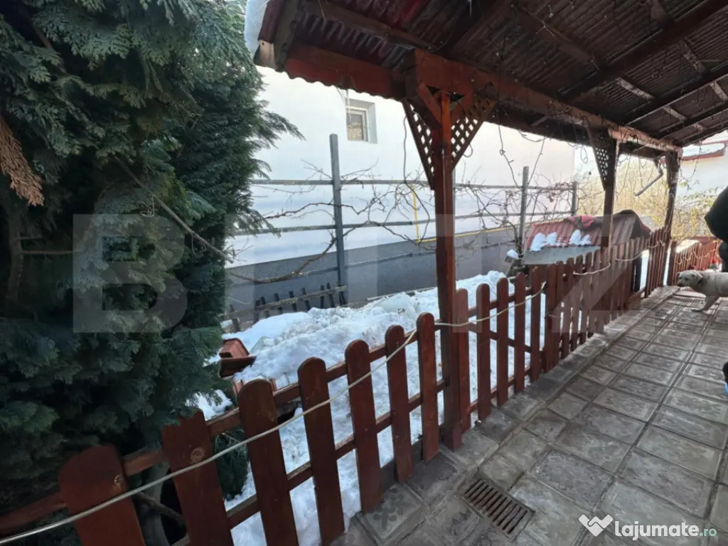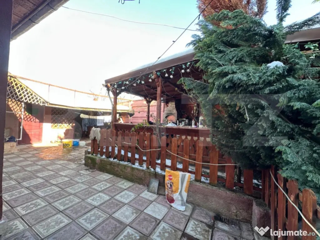 Curtea este amenajată cu zonă betonată, foișor și anexă lipită de casă (folosită ca spațiu pentru lemne/depozitare). Există acces auto direct în garaj și posibilitate de parcare pentru încă două mașini în fața casei.