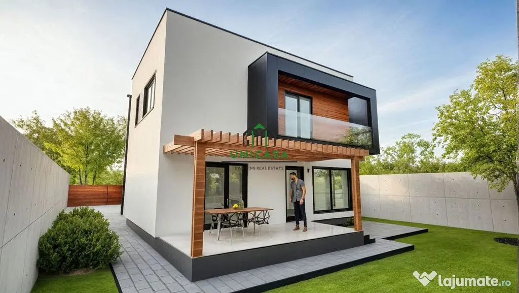 Proprietatea este amplasată pe un teren de 330 mp și este construită cu atenție la detalii și materiale de calitate superioară, oferind confort și eficiență energetică ridicată.