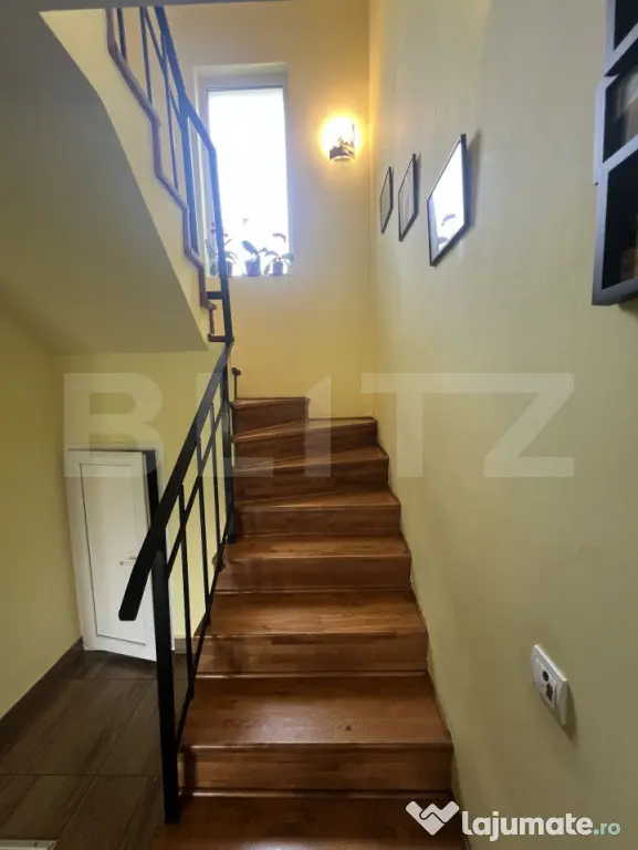 Confortul termic este asigurat de două centrale – una pe gaz și una pe peleți. În plus, casa beneficiază de panouri fotovoltaice de 5.5 kW, contribuind la eficiența energetică și reducerea costurilor.