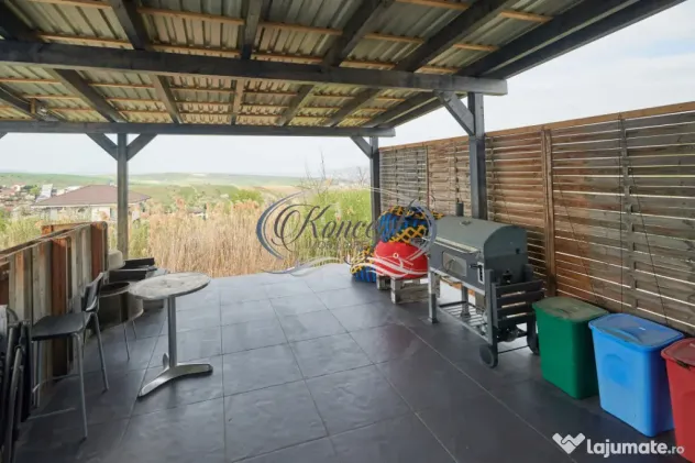 Casa are regim de inaltime parter plus etaj, a fost construita in anul 2015 si dispune de o suprafata utila de 120 mp, la care se adauga doua balcoane de aproximativ 4 mp fiecare si o terasa generoasa de aproximativ 30 mp la parter. Compartimentarea este practica si potrivita pentru o familie: la parter se afla zona de living cu bucatarie open space, camara, o baie si acces catre terasa si curte, iar la etaj sunt amenajate 3 dormitoare, o baie, dressing si cele doua balcoane cu vedere panoramica.