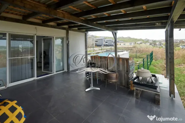 Curtea de 500 mp este amenajata cu gazon si ofera un cadru placut pentru relaxare, timp petrecut in aer liber sau activitati de familie. Terasa de la parter, panorama ampla, cele 2 - 3 locuri de parcare disponibile in fata casei si piscina exterioara destinata folosintei exclusive a chiriasului, completeaza avantajele acestei proprietati.