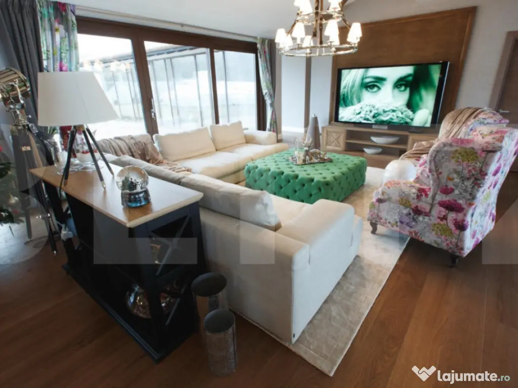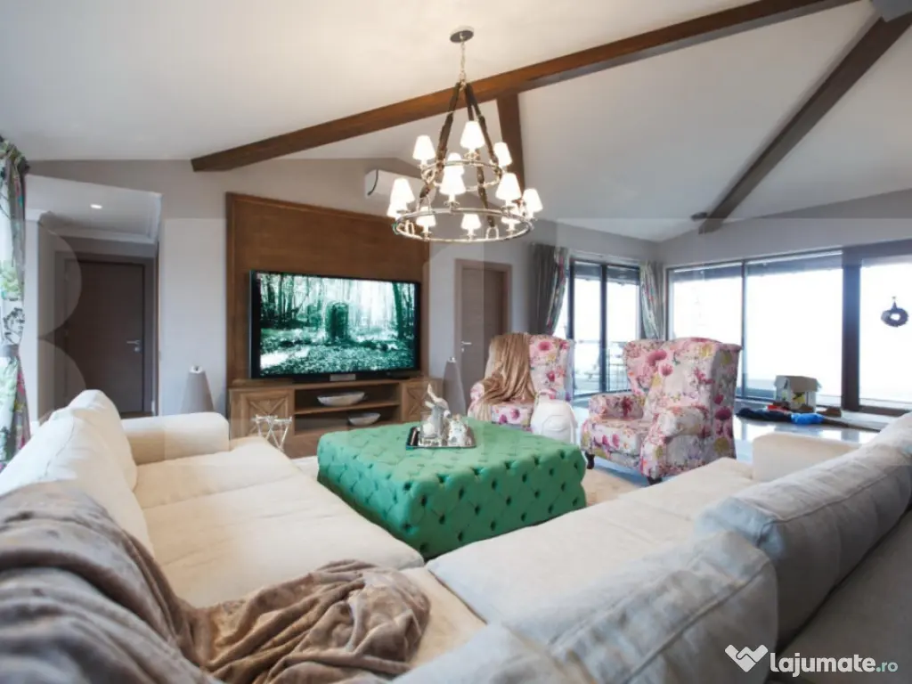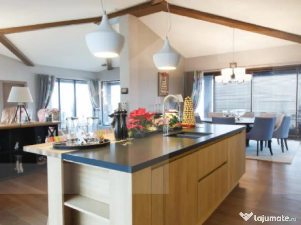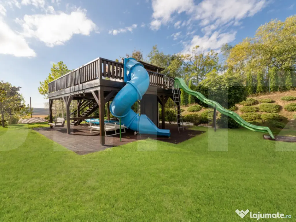 Blitz va ofera spre achiziție o reședință exclusivistă amplasată într-un cadru rezidențial nou din comuna Aiton, o zonă apreciată pentru liniște și accesibilitate. Proprietatea beneficiază de conexiuni rapide către Cluj-Napoca (aproximativ 20 minute), nodul de autostradă din Tureni și, implicit, către Aeroportul Internațional Avram Iancu Cluj, aflat la circa 10–15 minute distanță. Această vilă individuală se remarcă prin designul arhitectural modern, suprafețele generoase și nivelul ridicat al finisajelor, fiind concepută pentru un stil de viață confortabil, elegant și eficient. Compartimentare inteligentă – Spațiu și armonie Parterul – zona de zi și dormitoarele Interiorul este dominat de o zonă open-space amplă, scăldată în lumină naturală datorită vitrajelor extinse. Atmosfera este una sofisticată, dar primitoare. • Living spațios, ideal pentru relaxare și socializare; • Bucătărie complet echipată cu electrocasnice premium Miele; • Zonă de dining potrivită pentru mese în familie sau întâlniri cu până la 10 invitați; • Spații auxiliare bine organizate: cămară și dressing; • Dormitor pentru oaspeți cu baie proprie; • Birou dedicat activităților profesionale desfășurate de acasă; • Baie de serviciu; • Două dormitoare pentru copii, fiecare cu baie proprie; • Suită matrimonială impresionantă, cu dressing generos și baie privată amenajată la standarde premium. Subsolul – zonă multifuncțională Nivelul inferior este gândit pentru relaxare și utilitate: • Cameră de hobby cu masă de biliard și sistem performant de ventilație; • Două încăperi mari pentru depozitare; • Spălătorie și cameră tehnică; • Sală de fitness; • Zonă wellness cu saună și perete decorativ din sare naturală. Dotări și tehnologie de ultimă generație Imobilul se predă complet mobilat și utilat, integrând branduri de renume precum Miele, Bang & Olufsen și Villeroy & Boch. Confortul este susținut de: • Sistem smart home pentru control integrat; • Jaluzele electrice automatizate prin stație meteo; • Sistem de alarmă și supraveghere video; • Încălzire prin centrală pe gaz și ventiloconvectoare; • Panouri fotovoltaice cu putere instalată de 25 kW, pentru eficiență energetică sporită Exterior – Relaxare la tine acasă Curtea amenajată este un veritabil spațiu de recreere, având ca element principal o piscină exterioară încălzită, cu o suprafață impresionantă de 185 mp . Proprietatea mai include: • Garaj pentru două autoturisme; • Terasă acoperită; • Zonă de joacă pentru copii; • Foișor echipat pentru barbecue și bar. această vilă reprezintă o alegere ideală pentru cei care își doresc intimitate, confort și acces rapid către oraș, fără a renunța la liniștea unei comunități selecte. Vă invităm să descoperiți această proprietate printr-o vizionare ! Cod ofertă / ID BLITZ: P165356 Id intern: P165356 Număr Băi: 5 Nr. locuri parcare: 3 Curent Apă Canalizare Gaz Climă