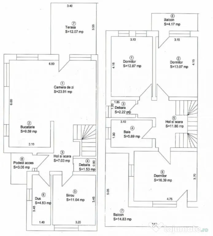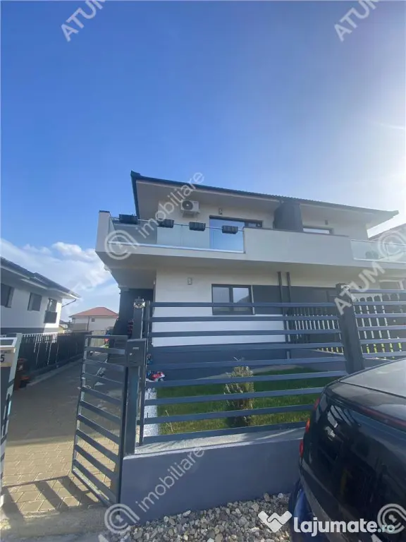 De vanzare casa tip duplex, la cheie, complet mobilata si utilata, compusa din 5 camere cu suprafata totala de 144 mp, localizata in orasul Cisnadie langa Sibiu, intrr-un cartier nou de case cu priveliste asupra Muntilor Fagaras si a Cetatii Cisnadioara. Casa este alcatuita din Parter Etaj Pod, terenul pe care a fost construita casa este de 290 mp, cu amprenta la sol de 90 mp, curtea libera fiind de 200 mp amenajata cu gazon, dale din beton si racord exterior de apa. Locuinta a fost edificata in anul 2021 pe structura de stalpi si grinzi din beton armat, caramida Porotherm Wienerber de 30 cm si beneficiaza de: izolatie termica exterioara cu polistiren de 10 cm peste care s-a acoperit cu tencuiala decorativa siliconata, acoperis din tigla marca Bramac ce include tot sistemul ( tigla, hidroizolatie, jgheaburi, burlane, parazapezi ) si zidaria dubla intre case de 70 cm. Suprafata utila a casei este de 120 mp utili si sunt distribuiti astfel. Parterul este compus din camera de zi 23.91 mp unde se afla si zona pentru servirea mesei, birou/camera oaspetilor de 11.04 mp, bucatarie de 9.59 mp care prezinta posibilitate de separare, baia de 4.83 mp care deserveste zona de zi, debara de 1.53 mp, holul casa scarii de 7.06 mp si podestul de 3.06 mp prin intermediul caruia se face accesul in casa. Etajul este alcatuit din 3 dormitoare dintre care cel matrimonial de 16.39 mp dotat cu aer conditionat, inca 2 dormitoare cu suprafate de 13.07 mp si respectiv 12.87 mp, dressing de 2.22 mp si baie 5.89 mp dotata cu geam care deserveste zona privata a casei, casa scarii holul de 11.86 mp din care se poate face accesul in podul casei prin intermediul unei scari retractabile. Separat de suprafata utila a casei mentionam terasa aflata la parter de 12.07 in care se face accesul din camera de zi iar la etaj de balconul de 14.83 mp in care se face accesul din dormitorul matrimonial beneficiind de o panorama superba asupra cetatii si a muntilor, dormitorul de 13.07 mp de altfel beneficiiaza de balconul sau propriu de 4.17 mp si podul in suprafata egala cu etajul fiind folosit ca si spatiu de depozitare. Proprietatea detine kit de panouri fotovoltaice cate genereaza 5kW si dispune de intreg sistemul inclusiv acumulatori. Amenajarile interioare au fost realizate in anul 2021 imediat dupa finalizarea constructiei, sunt de calitate superioara si au fost intretinute cu mare responsabilitate, aceasta dispunand de: centrala termica marca Immergas in condensare cu senzor de gaz, incalzire in pardoseala pe Parter Etaj cu distribuitor separat, instalatie termica si electrica din cupru, tamplarie marca Salamander cu 5 camere si 3 foi de sticla cu protectie solara si plase anti insecte, usa de acces marca Salamander izolatoare termic si fonic, atat usile interioare sunt marca Porta Doors cat si parchetul de trafic inters 14 mm, prize si intrerupatoare marca Schneider, gresie si faianta. Casa se va preda complet mobilata si utila cu: mobilier de bucatarie si electrocasnice incorporate ( plita pe gaz, cuptor electric, hota, frigider ), mobilier din living, dormitoarele complet mobilate precum si baile. Intregul mobilier este facut din MDF pe comanda marca Naturlich. Casa se afla intr-un cartier nou de case din orasul Cisnadie, in apropiere se afla toate facilitatile necesare vietii de zi cu zi. Accesul inspre oras se poate face prin intermediul mai multor cai de acces. Valoarea de achzitie a locuintei este de 250.000 euro negociabil, aceasta se poate achzitiona si prin intermediul unui credit bancar. ID intern: 1704. Număr Băi: 2 Posibilitate parcare: Da Nr. locuri parcare: 2 Curent Apă Canalizare Gaz