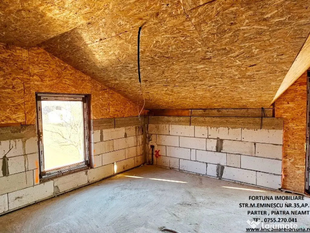 Oferim spre achizitionare un imobil compus din suprafața de 1.200 mp teren, pe care este edificată o casă, cu regim de înălțime P+M, cu suprafața construita la sol de 100 mp, suprafața utilă desfășurată de 180 mp, construită în anul 2024, pe fundații din beton armat, zidărie din BCA, acoperita cu tablă profilata tip Lindab, prevăzută cu termopane și termosistem exterior de 10 cm, situată în com. Alexandru cel Bun, Sat Bistrița, jud. Neamț, la 5 minute de oraș, în zonă verde, liniște și aer curat.