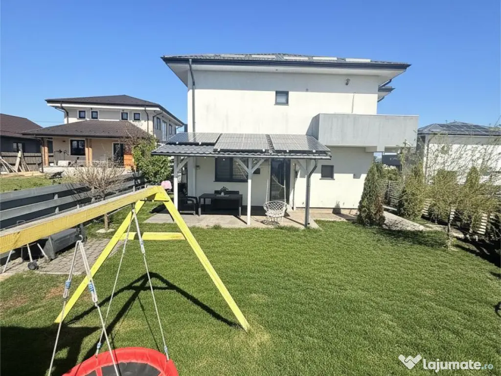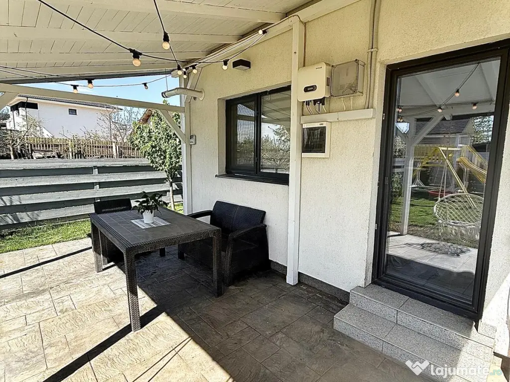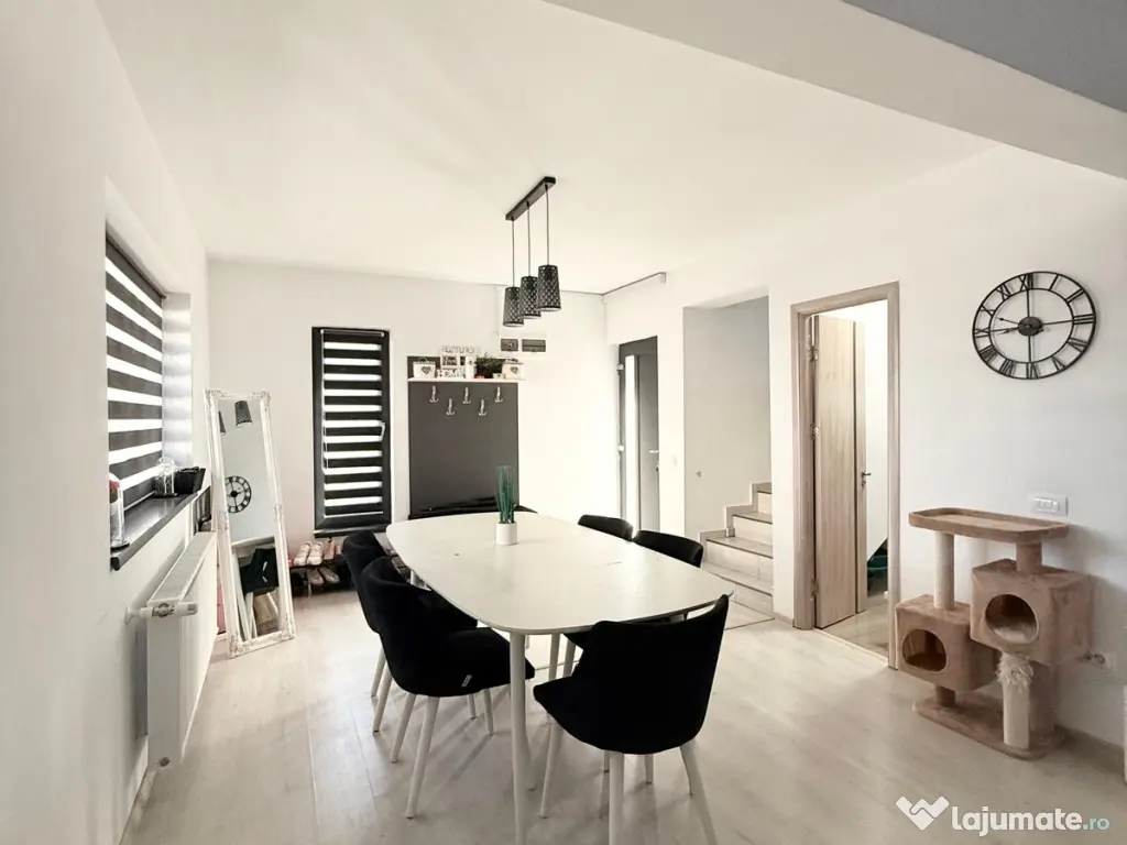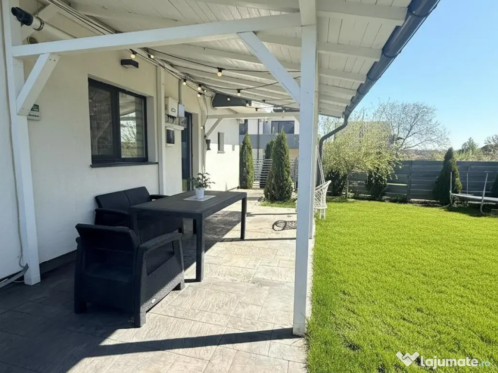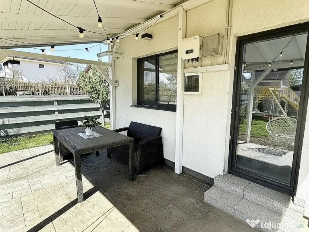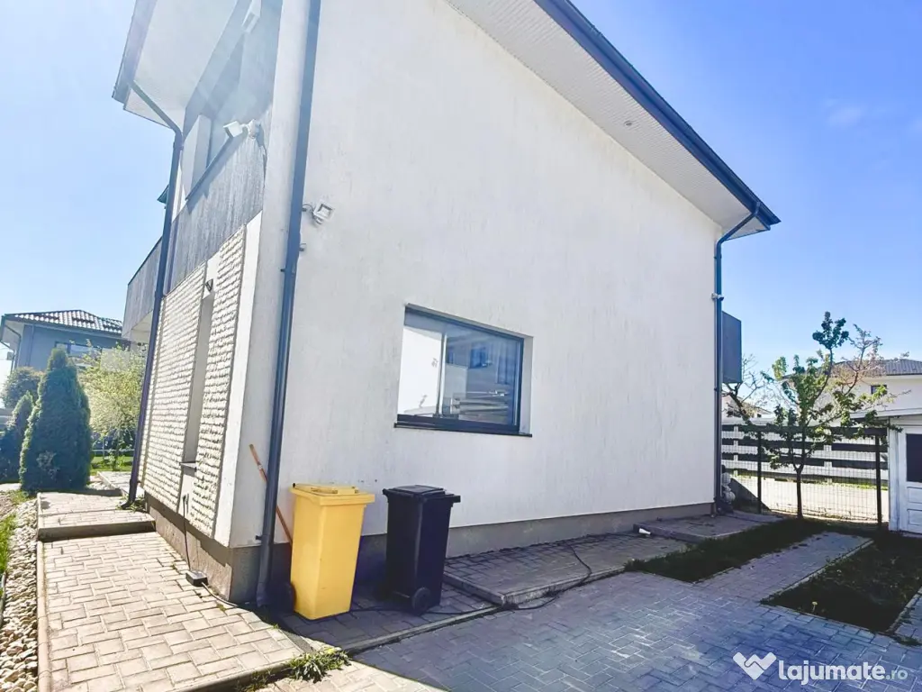 Vă propun spre vânzare o casă modernă, complet mobilată și eficientă energetic, situată excelent în Miroslava, pe strada Stadionului, la doar 800 m de Primărie, într-o zonă liniștită cu acces direct din asfalt.