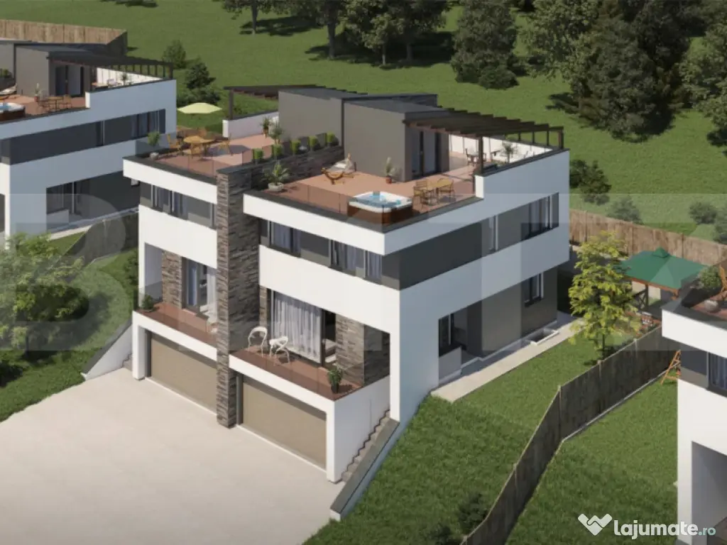 Blitz vă prezintă spre vânzare un ansamblu rezidențial modern, format din locuințe individuale cu arhitectură contemporană, finisaje de calitate și poziționare excelentă, ce oferă intimitate, confort și siguranță. Fiecare unitate dispune de o suprafață generoasă de 190 mp utili, o terasă panoramică și un teren de 500 mp, fiind ideală pentru familii care își doresc spațiu, lumină naturală și o priveliște spectaculoasă. Compartimentare: • Subsol: garaj pentru 2 mașini, spațiu de depozitare, spălătorie, sală hobby, scară interioară • Parter: living spațios cu acces pe terasă, bucătărie și baie • Etaj: 3 dormitoare, 2 băi, hol • Terasă panoramică: 70 mp – ideală pentru relaxare, zonă lounge sau jacuzzi Detalii tehnice și dotări: -Construcție solidă din cărămidă Porotherm de 30 cm, pentru izolație fonică și termică superioară -Ferestre VEKA, 7 camere, 3 foi de sticlă cu baghetă caldă (element care reduce pierderile de căldură la marginea geamului și previne condensul) -Încălzire în pardoseală în toată casa -Centrală termică Viessmann, eficientă și fiabilă -Termosistem de 15 cm grosime -Garaj cu ușă automată și infrastructură pregătită pentru stație de încărcare electrică Predare: Casele se livrează la stadiul de semifinisat în interior și complet finisat la exterior, cu gazon, pavaj, garduri și porți de acces montate. Această proprietate îmbină perfect calitatea construcției, designul modern și confortul zilnic, oferind viitorilor proprietari un loc deosebit pentru a numi „acasă”. Cod ofertă / ID BLITZ: P157448 Id intern: P157448 Număr niveluri imobil: 1 Număr Băi: 3 Curent Apă Canalizare Gaz