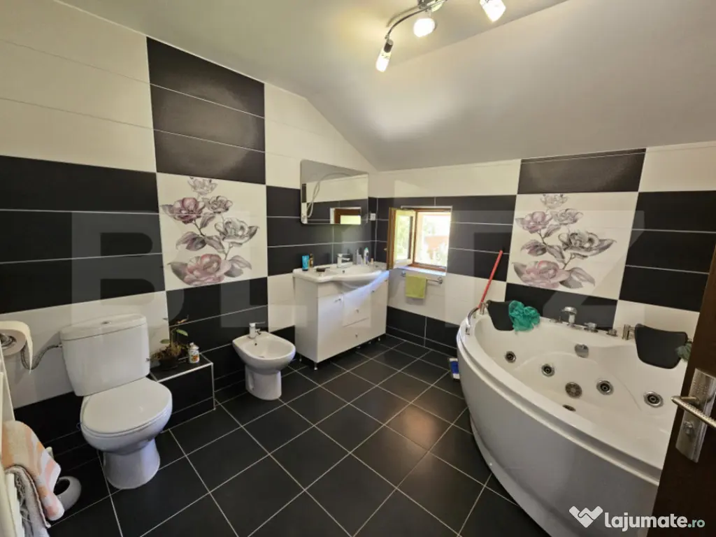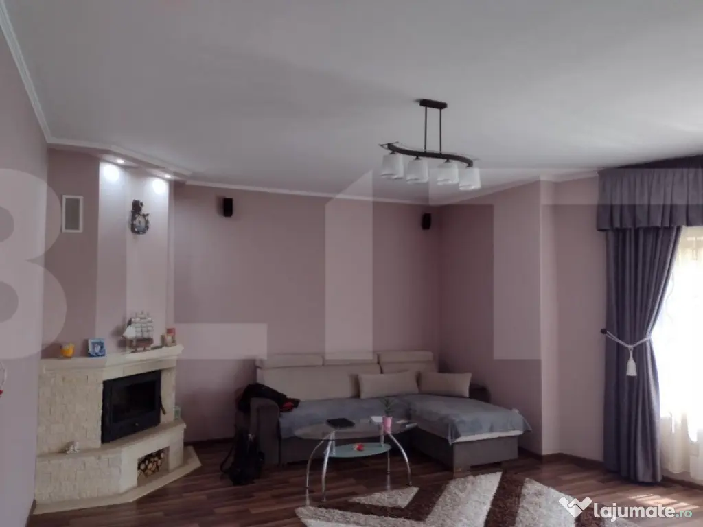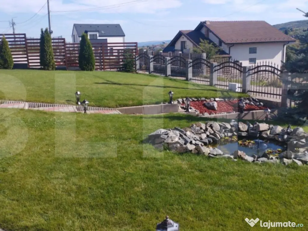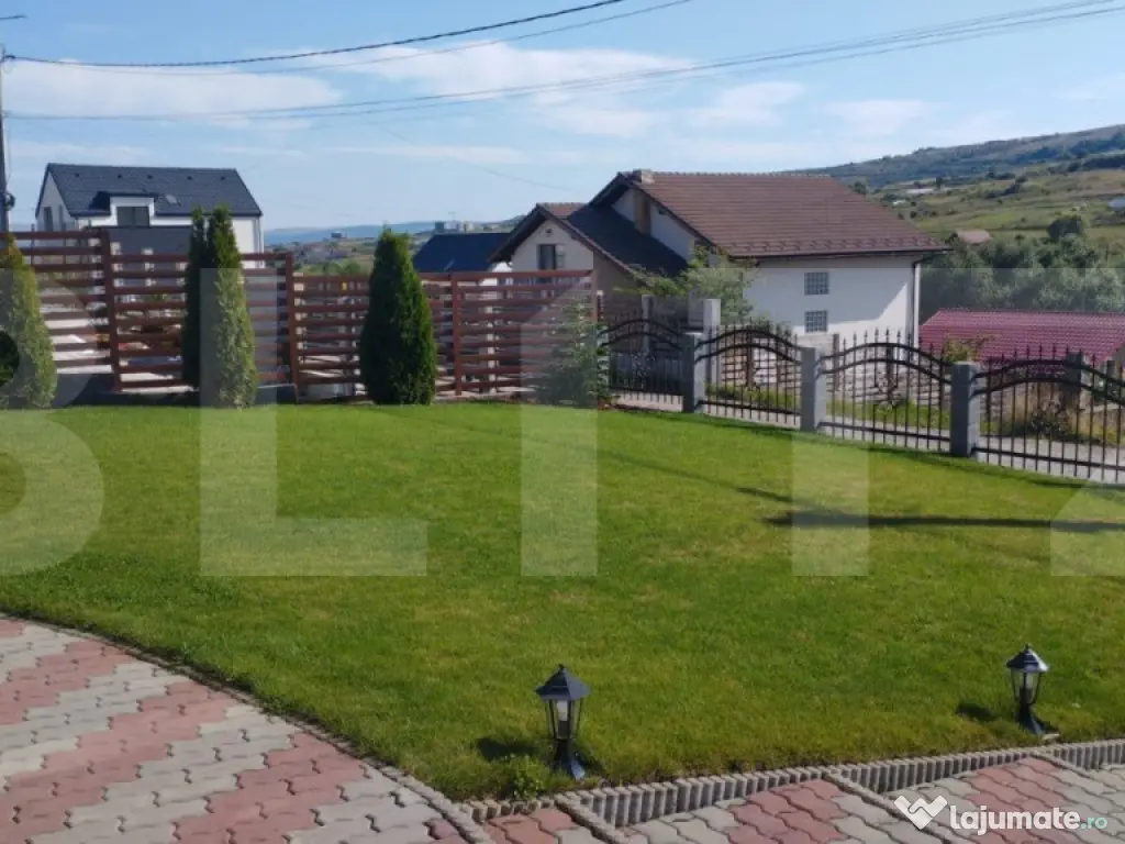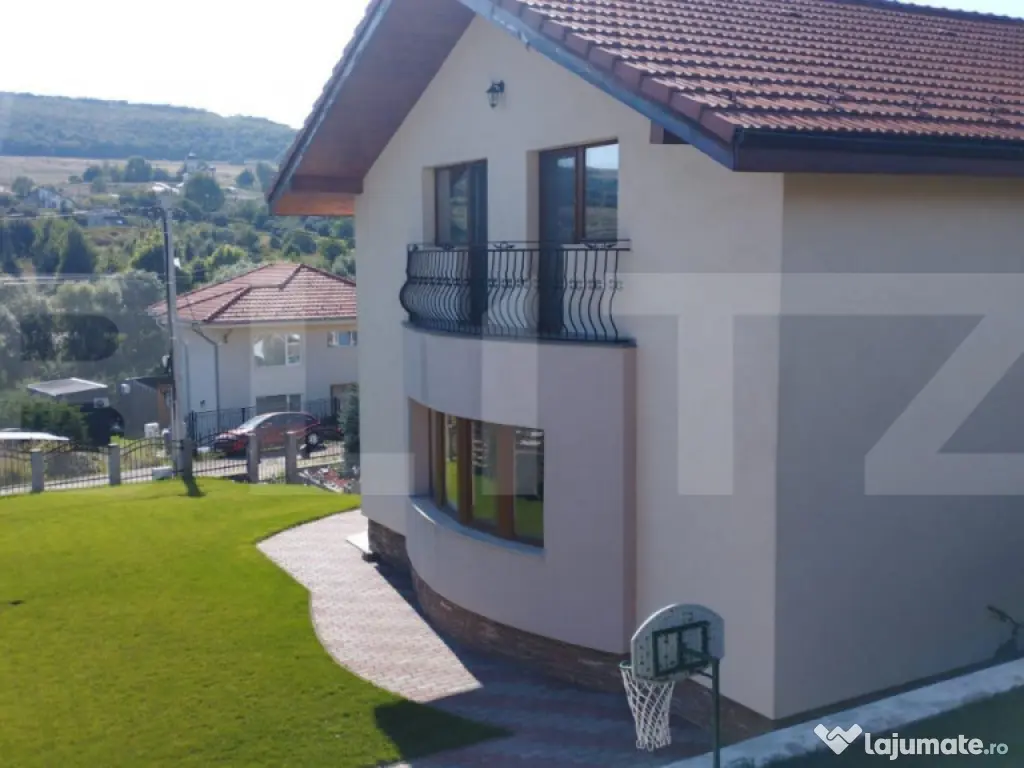 Incalzirea casei se realizeaza cu o centrala termica pe gaz, prin pardoseala, iar in living este montat un termosemineu pe lemne. Curtea casei este frumos amenajata, cu gazon si sistem de irigatii subteran (alimentata dintr-o fantana proprie) precum si cu un foisor generos cu zona barbeque si de servit masa. Portile de acces auto sunt automate. Proprietatea dispune de toate utilitatile inclusiv fibra optica.