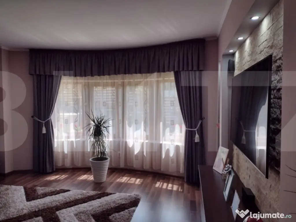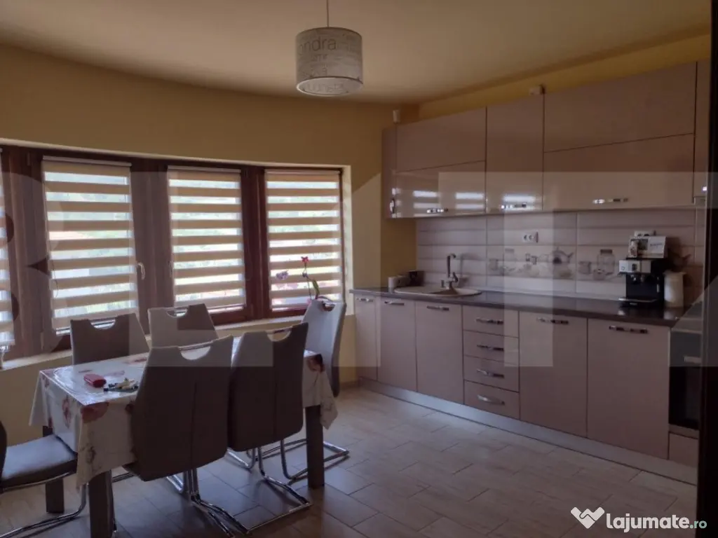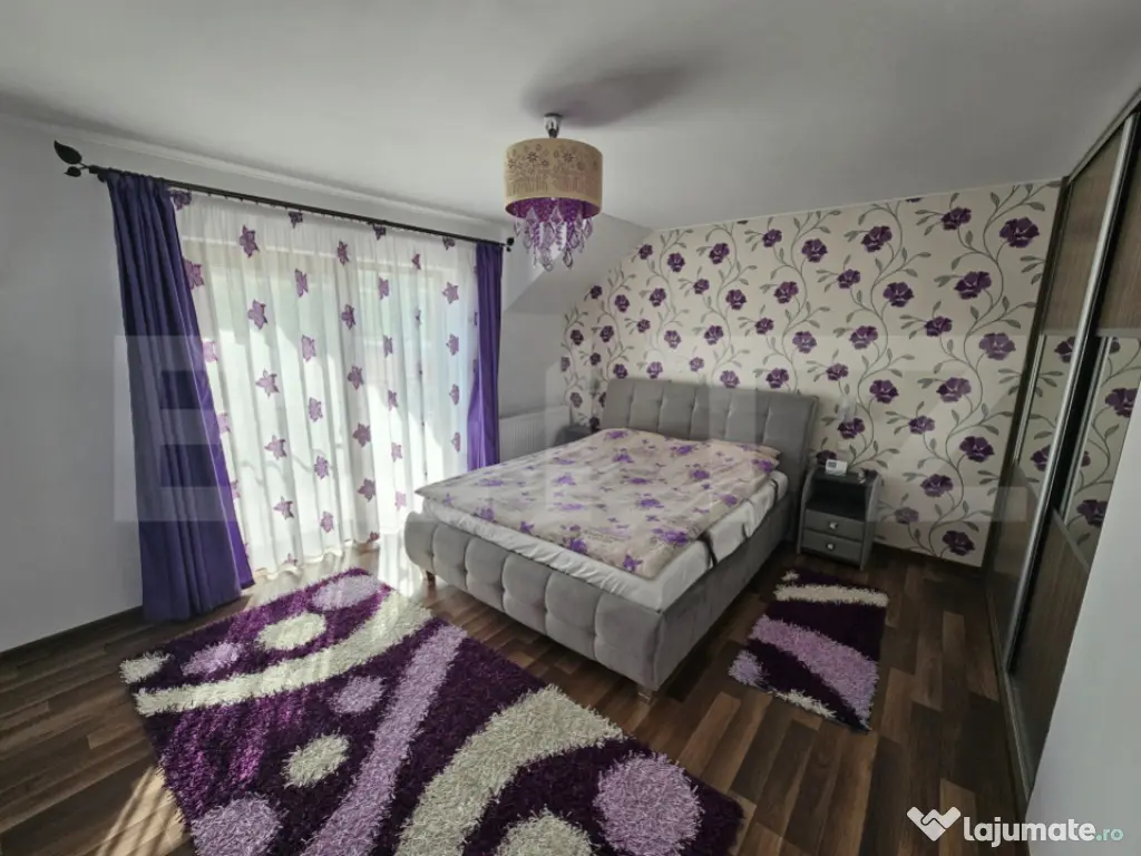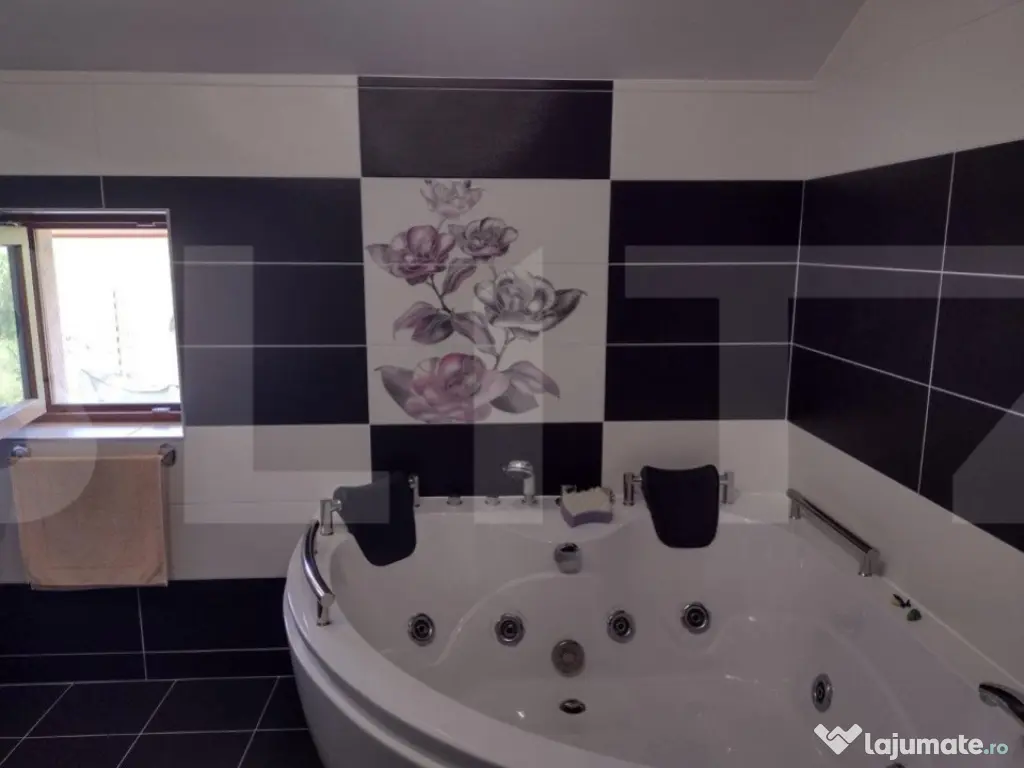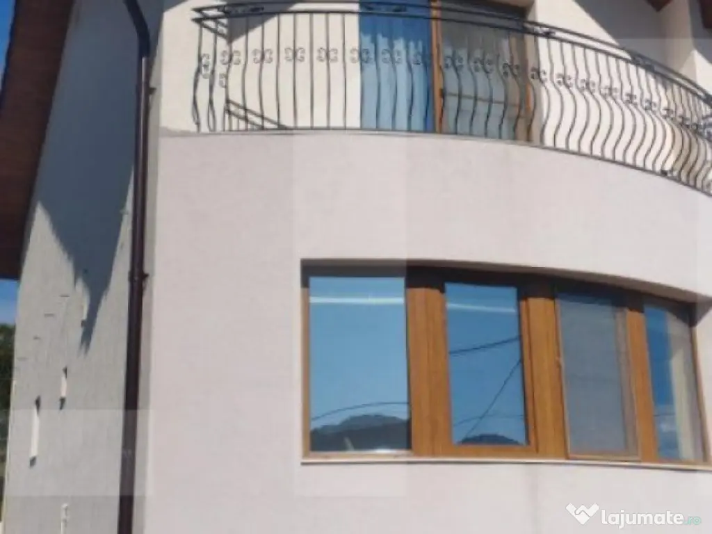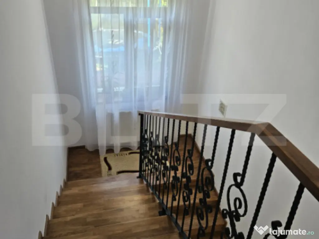 Incalzirea casei se realizeaza cu o centrala termica pe gaz, prin pardoseala, iar in living este montat un termosemineu pe lemne. Curtea casei este frumos amenajata, cu gazon si sistem de irigatii subteran (alimentata dintr-o fantana proprie) precum si cu un foisor generos cu zona barbeque si de servit masa. Portile de acces auto sunt automate. Proprietatea dispune de toate utilitatile inclusiv fibra optica.