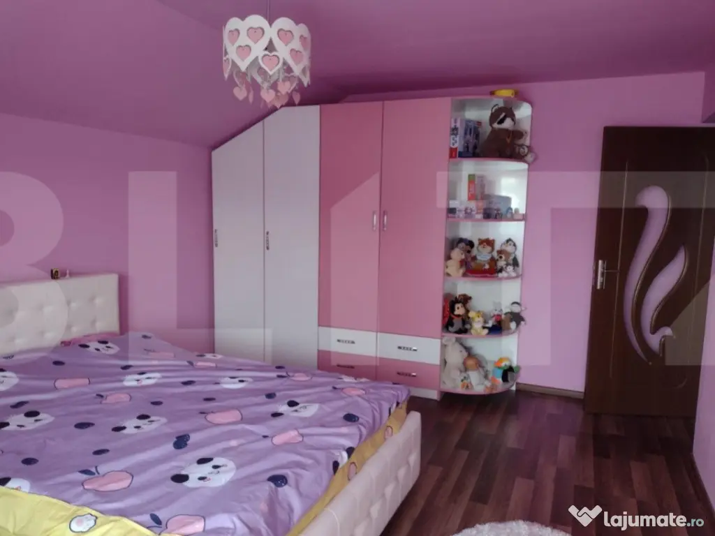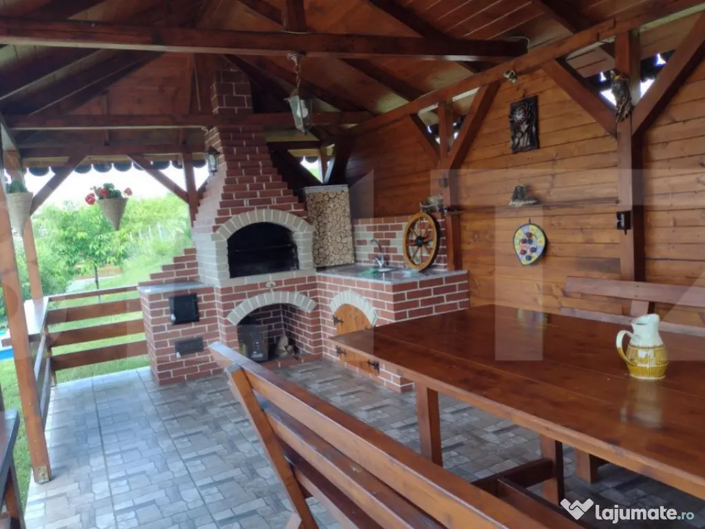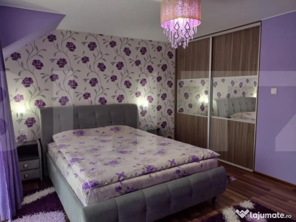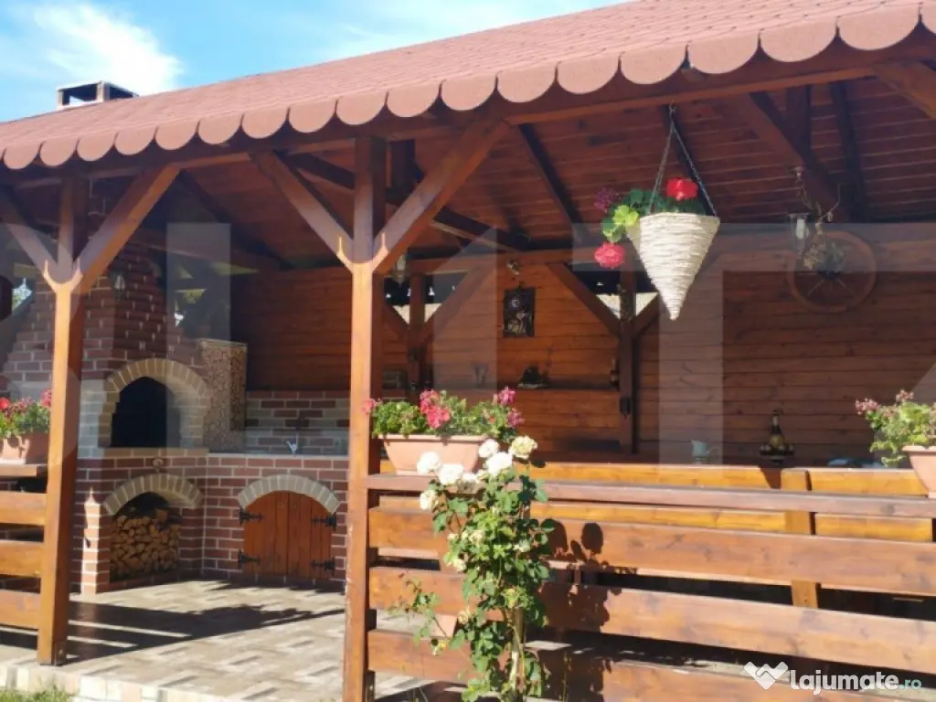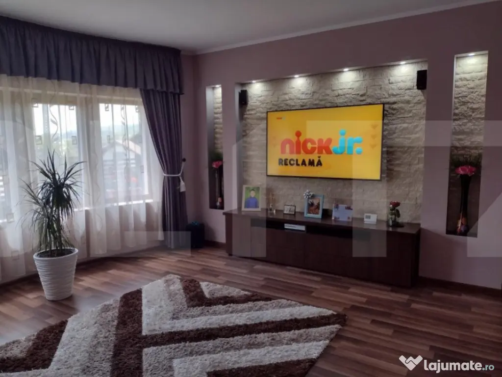 Incalzirea casei se realizeaza cu o centrala termica pe gaz, prin pardoseala, iar in living este montat un termosemineu pe lemne. Curtea casei este frumos amenajata, cu gazon si sistem de irigatii subteran (alimentata dintr-o fantana proprie) precum si cu un foisor generos cu zona barbeque si de servit masa. Portile de acces auto sunt automate. Proprietatea dispune de toate utilitatile inclusiv fibra optica.