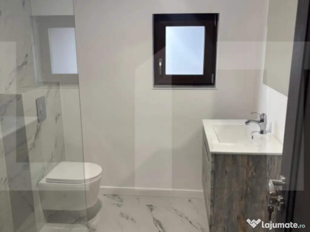 BLITZ vă oferă spre vânzare o casă nouă, tip P+E, finisată complet, situată într-o zonă rezidențială liniștită, ideală pentru locuit, cu acces facil către oraș. Proprietatea are o suprafață utilă de aproximativ 150 mp și este amplasată pe un teren generos de 640 mp, beneficiind de curte proprie, poartă de acces și posibilitatea de parcare pentru până la 3 autoturisme în curte, plus locuri suplimentare în fața imobilului. Casa este construită recent și finalizată cu materiale de calitate, având acoperiș din țiglă, geamuri termopan triplu vitrate și rulouri electrice cu telecomandă, individuale pentru fiecare geam. Imobilul este racordat la utilități, dispune de centrală termică proprie pe gaz cu boiler încorporat și încălzire în pardoseală atât la parter, cât și la etaj, oferind un confort termic ridicat pe tot parcursul anului. Finisajele sunt moderne, realizate cu gresie, faianță și parchet, fiind pregătită pentru mutare imediată. Compartimentarea este practică și bine gândită. La parter regăsim un living spațios cu bucătărie tip open-space (stil american), o cameră, o baie, o cameră tehnică și o cămară, precum și o terasă generoasă de aproximativ 30 mp în partea din spate, ideală pentru relaxare. La etaj se află trei camere și două băi, dintre care un dormitor matrimonial cu baie proprie și dressing, plus încă două camere deservite de o baie separată pe hol. Toate băile sunt dotate cu geam pentru aerisire naturală, cabină de duș, chiuvetă și WC. Proprietatea se remarcă prin spațiul generos, compartimentarea eficientă, dotările moderne și poziționarea într-o zonă rezidențială aerisită, fiind alegerea ideală pentru o familie care își dorește confort, intimitate și o locuință nouă, complet finisată. Cod ofertă / ID BLITZ: P164912 Id intern: P164912 Număr niveluri imobil: 1 Număr Băi: 3 Nr. locuri parcare: 3 Curent Apă