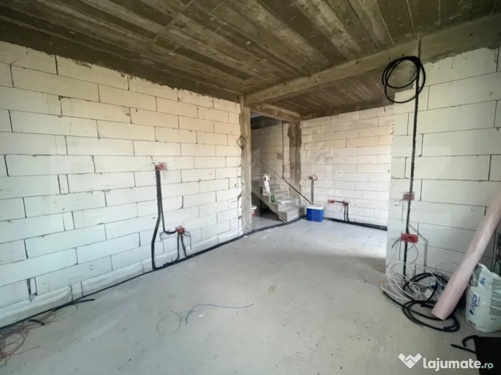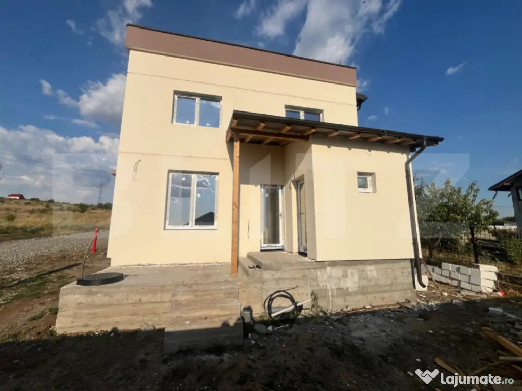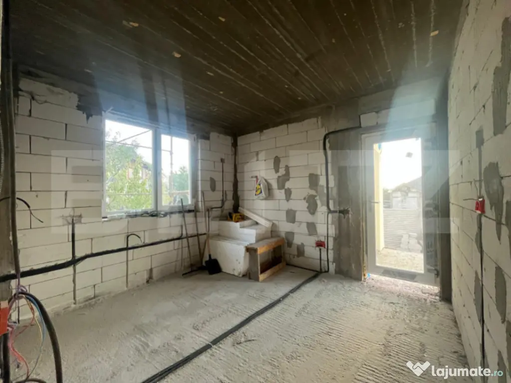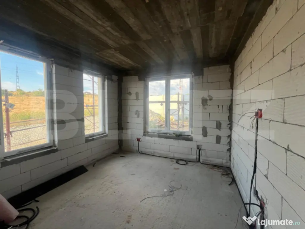 Blitz v a propune spre achizitie un duplex compus din doua casa P+1, fiecare avand o suprafata utila de 90 mp si 202 mp de teren aferent cu 13,5 ml deschidere la strada. Constructia este realizata la inceputul acestui an, avand o structura solida din beton armat si zidaria din BCA, avand placa beton atat intre parter si etaj cat si peste etaj, este acoperita cu tabla Bilka, izolata si cu decorativa siliconata, aplicata. La parter regasim un hol din care facem putem accesa zona de living, baia si bucataria de unde putem iesi in terasa si catre camera tehnica. La etaj avem disponibile doua dormitoare, unul dintre ele avand balcon si o baie. Casa beneficiaza de curent, apa de la retea, fosa septica pana in viitorul apropiat, canalizarea fiind in zona iar ca sursa de incalzire v a beneficia de pompa de caldura cu panouri fotovoltaice. Pretul este pentru constructia la stagiul prezentat si in poze fiind posibila vanzare la orice stagiu, inclusiv la cheie, la un alt pret. Pentru orice fel de detalii nu ezitati sa ne contactati! Cod ofertă / ID BLITZ: P150313 Id intern: P150313 Număr Băi: 2 Nr. locuri parcare: 2 Curent Apă