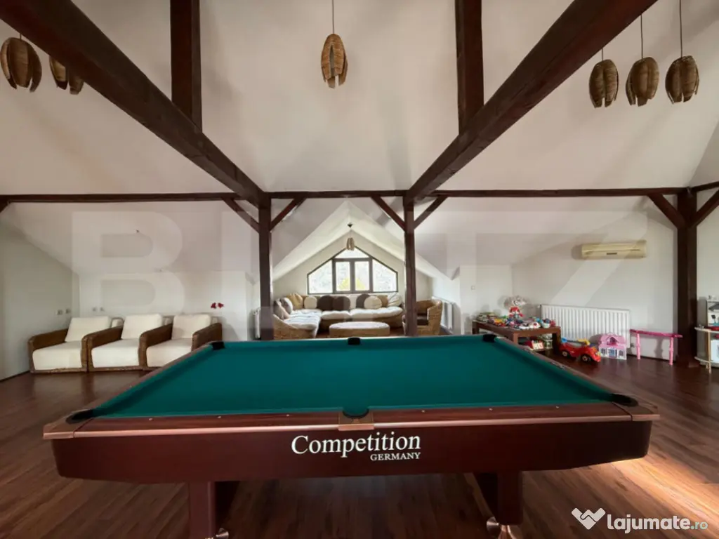 Blitz va propune spre achizitie o proprietate de a dreptul inedita atat din punct de vedere al constructiei dar si din prisma locatiei. Constructia cu regim de inaltime P+1+M este realizata in regim propriu avand o suprafata construita totala de aproximativ 500 mp si dispune de un teren de 1057 mp. La parter avem zona de living foarte spatios, care este impartit intr o zona de relaxare cu acces catre terasa exterioara si piscina si o zona de luat masa care se continua cu bucataria semideschisa complet utilata si mobilata, baie si camera tehnica. La etaj regasim trei dormitoare spatioase, fiecare dintre acestea cu dressing, baie proprie si balcon. La mansarda avem o zona deschisa cu canapele, masa de biliard, grup sanitar, perfecta pentru zona de relaxare sau petreceri. Intreaga proprietatea este foarte luminoasa si aerisita, fiind ideala pentru resedinta mult visata dar totodata este pretabila si pentru activitati comerciale sau clinica. Curtea este imprejmuita cu gard zidit si amenajata cu pavele, gazon, pomi decorativi, pomi fructiferi, flori. Totodata dispune de o bucatarie de vara, piscina, zona de gratar, doua terase, camera tehnica si camera de depozitare. Proprietatea dispune de toate utlitatile si este incalzita prin intermediul unei centrale pe gaz. Pentru mai multe detalii nu ezitati sa ne contactati! Cod ofertă / ID BLITZ: P165868 Id intern: P165868 Număr Băi: 5 Nr. locuri parcare: 5 Curent Apă Canalizare Gaz Climă