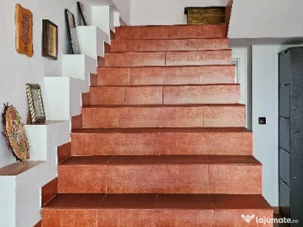 Parter : Terasă mare acoperită, living, dining room, bucătărie, debara, baie și garaj generos ce oferă loc de parcare pentru mașină și pentru amenajarea unui mic atelier de lucru.