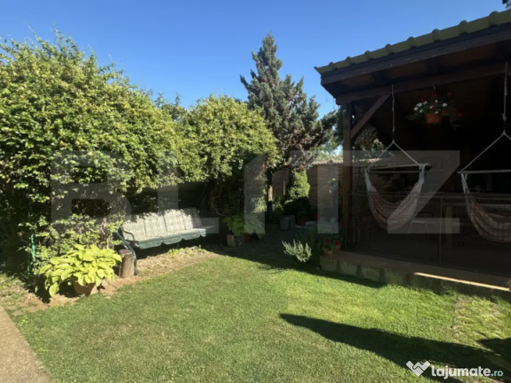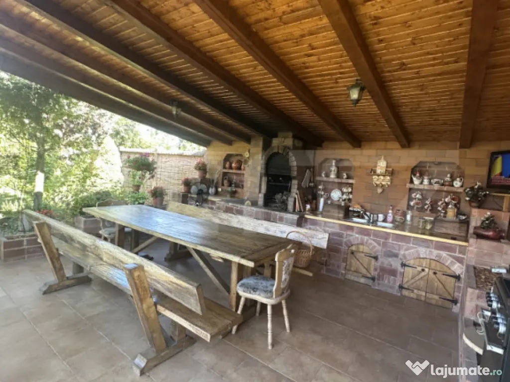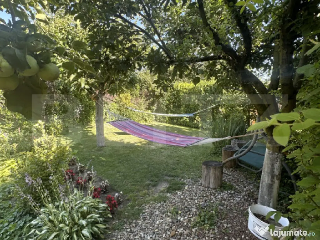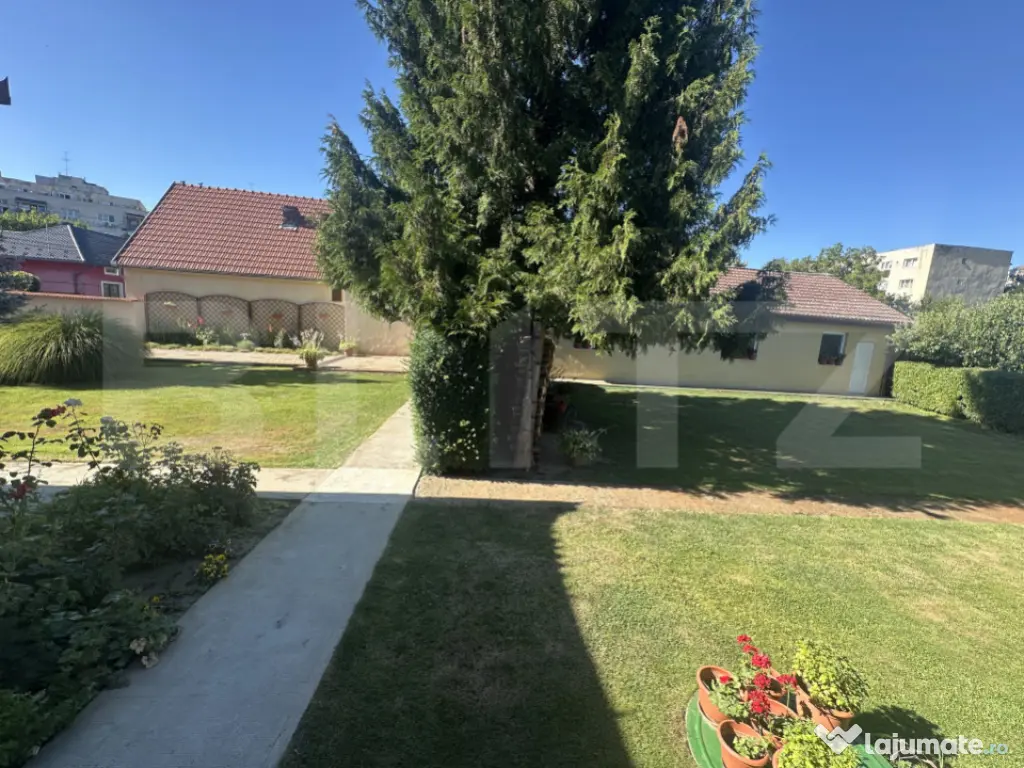 Curtea este cu adevărat spectaculoasă – o oază verde, plină de vegetație, plante ornamentale și arbori maturi, oferind intimitate și liniște. Este locul perfect pentru relaxare în aer liber sau pentru joaca celor mici. Grădina de zarzavaturi este bine organizată și oferă posibilitatea cultivării de legume proaspete, chiar în propria curte.