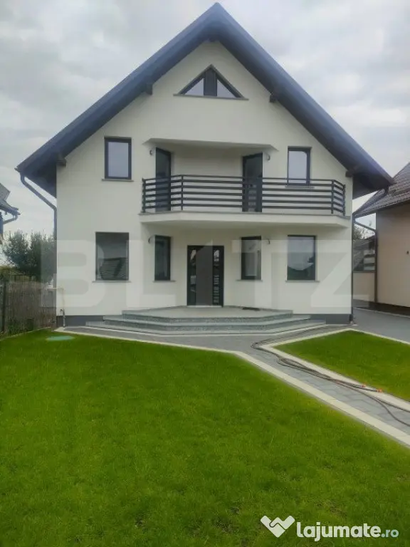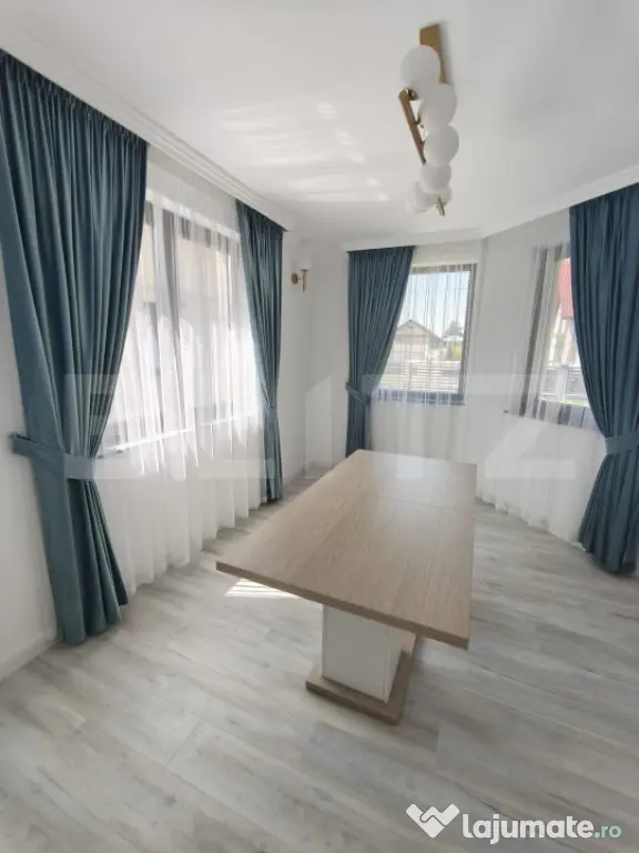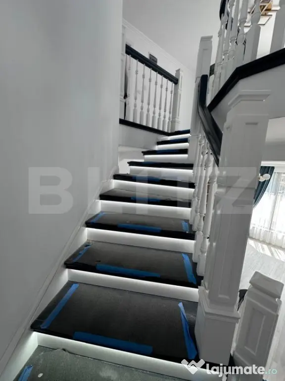 Fiecare detaliu al acestei case a fost gândit cu atenție: încălzirea în pardoseală asigură un confort termic optim în toate anotimpurile, scările din lemn masiv, iluminate cu gust, adaugă un plus de eleganță, iar garajul cu poartă automată îți oferă siguranța și confortul de a-ți parca mașina în orice condiții meteo.