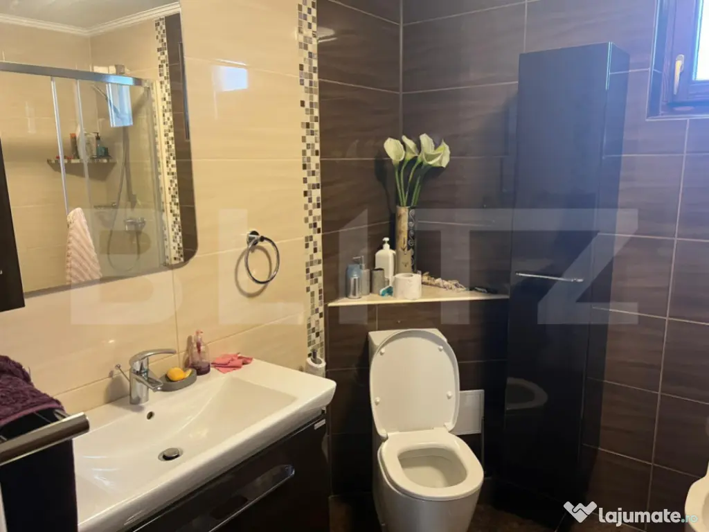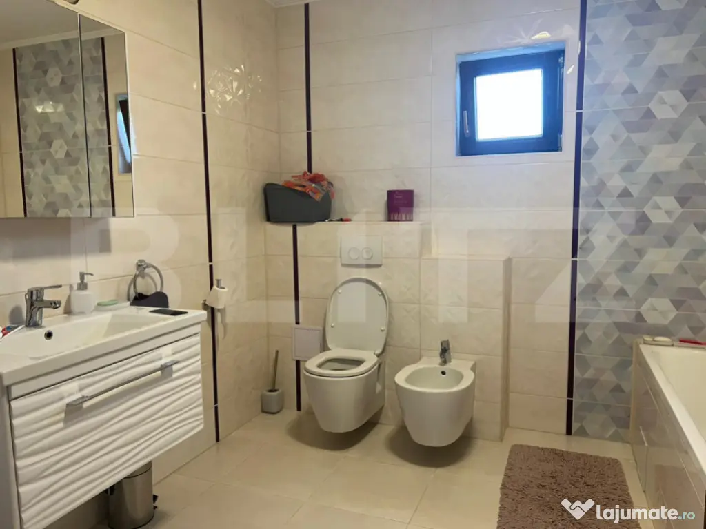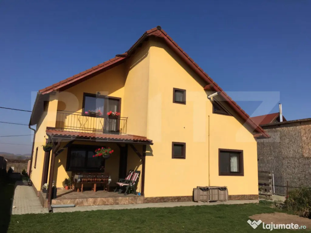 Blitz vă oferă spre vânzare o casă deosebită în Sângeorgiu de Mureș, construită în regim propriu, cu materiale de calitate și finisaje premium. Imobilul a fost edificat în 2014, finalizat în 2015, și este construit pe fundație de beton, cu pereți din cărămidă, izolație exterioară din polistiren, acoperiș cu țiglă Bramac și ferestre termopan cu profil din lemn. Casa are un regim de înălțime P+1, o suprafață utilă de 180 mp, și este amplasată pe un teren de 500 mp. Încălzirea este asigurată de o centrală termică Bosch, cu calorifere triple, oferind eficiență și confort termic pe tot parcursul anului. Dispune de garaj și carport. Compartimentare: Parter: Living generos cu zonă de dining, mobilat cu mobilier din lemn masiv, bucătărie open space complet echipată, cu mobilier premium la comandă și insulă centrală, cămară, hol de acces, baie și o cameră multifuncțională. Etaj: 3 dormitoare spațioase, o baie, un dressing bine organizat. Podul este complet podit și izolat cu vată minerală. Proprietatea se vinde partial mobilată. Situată într-o zonă foarte liniștită, ideală pentru familii sau pentru cei care caută confort, calitate și intimitate. Prețul este ușor negociabil. Vă așteptăm cu drag la vizionare! Cod ofertă / ID BLITZ: P150069 Id intern: P150069 Număr niveluri imobil: 1 Număr Băi: 3 Curent Apă Canalizare Gaz