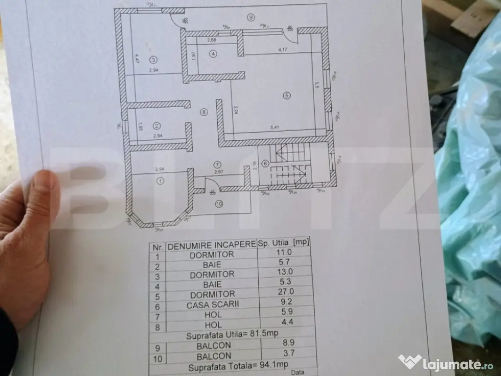 Blitz va propune spre vanzare o casa semifinisata in Ploiestiori la 3 minute de primarie. Contine 5 camere, 3 bai, living mare, bucatarie separata, 3 intrari, 2 balcoane. Etaj 81.85 mp utili, parter 82,3 utili, mansarda 90 mp, 2 balcoane 12 mp. Casa este facut cu inginer de santier, se poate veni cu oricine pentru verfificare. Fundatie 1,85 m aprox 8-9 tone fierbeton, caramida de 25 mp, pereti interior de 30 cm doar caramida, instalatie electrica facuta, incalzire in pardosea pe fiecare nivel, camera tehnica, termopane tripane. Casa este racordata la gaz , electricitate , canalizarea este la poarta . Pretul este foarte putin negociabil, va asteptam cu drag la vizionare! Cod ofertă / ID BLITZ: P136336 Id intern: P136336 Număr niveluri imobil: 2 Număr Băi: 3 Nr. locuri parcare: 2 Curent Apă Gaz