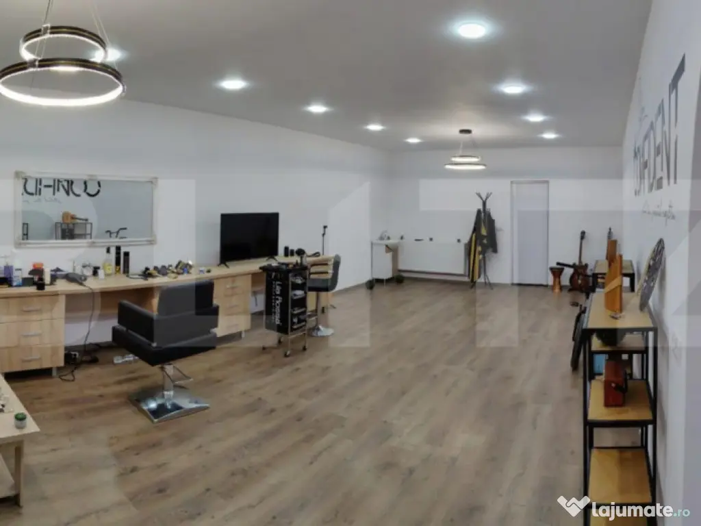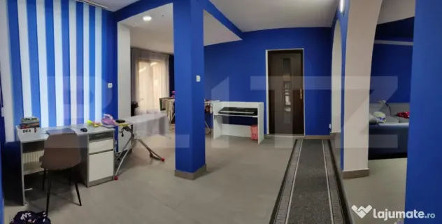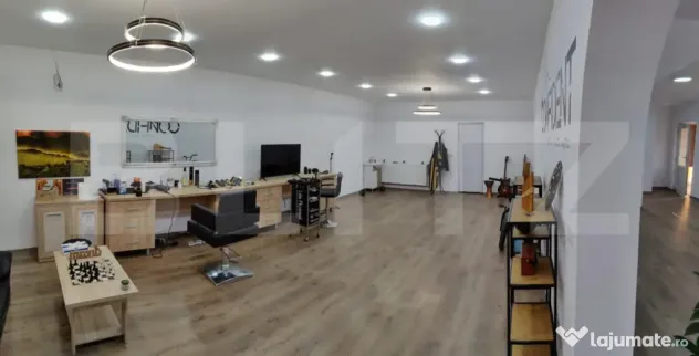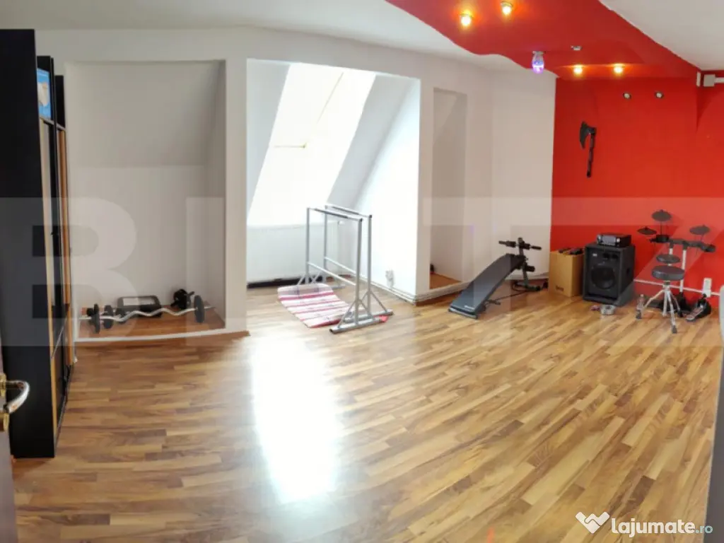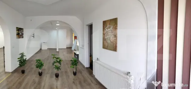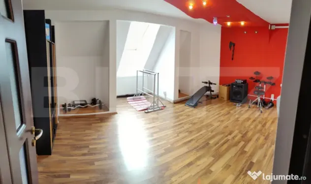 Zona pentru uz comercial in prezent, este compartimentata in doua camere mari cu bai separate si acces etaj pe scara interioara din lemn unde gasim o camera foarte generoasa open space cu iesire in balcoane si o baie.