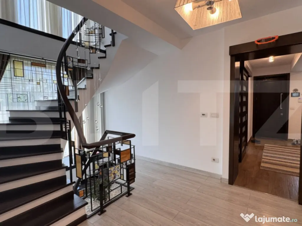 BLITZ propune spre vânzare o casă deosebită, cu regim de înălțime S + P + 2E, o suprafață utilă de 353 mp, ridicată pe un teren de 1.307 mp, din inima cartierului Veteranilor. Casa a fost construită în 2013 din BCA portant și folosind doar materiale de cea mai bună calitate, cu finisaje de top, spații bine gândite și racaordată la toate utilitățile, sistemul de încălzire fiind compus din 2 centrale de 35 kw în condensație pe gaz. Totodată, imobilul beneficiază și de un kit de panouri fotovoltaice care acoperă cea mai mare parte din consumul de energie electrică. Compartimentarea casei este una foarte practică, asigurându-se, totodată, un confort sporit, după cum urmează: - Subsol = garaj cu loc pentru 2 mașini și priză electrică de încărcare, casa scării și hol de unde se acceseaxză un spațiu depozitare/o cămară și camera tehnică - Parter = hol intrare, dressing, baie, bucătărie și un open space generos cu dinning și living, de unde se face trecerea spre curtea din spate a casei printr-o terasă acoperită - Etajul 1 = 3 dormitoare, din care unul matrimonial cu dressing, baie și balcon, o a doua baie și al doilea balcon pentru celelalte 2 dormitoare - Etaj 2 = loc de joacă open space, cu birouri și un dormitor pentru oaspeți, cu acces direct la o baie, ce se poate accesa și dintr-un hol din open space, care mai oferă acces la un dressing; dormitorul are acces și la un balcon cu vedere spre curtea din față, iar birourile la al doilea balcon ce dă spre curtea din spate Un element special al casei, o adevărată piesă arhitecturală unicat, îl reprezintă scara de tip elicoidal, cu mână curentă și trepte îmbrăcate în lemn, balustradă din fier forjat și sticlă colorată, cu candelabru ce coboară de la etajul 2 până la parter; costul acestei scări lucrate și montate manual pe poziție a fost de 40.000 euro. Pe lângă casa deosebită, cel de-al doilea beneficiu principal al acestei proprietăți îl reprezintă curtea mai mult decât generoasă, superb amenajată și foarte bine accesorizată. În partea din față avem poarta automată pentru acces auto situată în fața intrării în garaj, pavele, gazon, tuia, copaci, pietre și plante ornamentale, un mic iaz cu pești, două fântânițe, un coș de baschet, supraveghere video și sistem de iluminat. În partea din spate, pe lângă alte plante, gazon, copaci și o alee pietruită și placată regăsim un foișor ce poate fi folosit tot timpul anului, cu șemineu, sistem audio - video și o zonă de gătit în față super accesorizată ce cuprinde un grătar zidit, unul de tablă și o sobă cu plită, pentru a putea pregăti mese minunate pentru prieteni și familie atât în stil modern, cât și clasic, ca la bunica acasă; tot aici regăsim o căsuță pe post de magazie de unelte, un loc de joacă pentru copii cu spațiu pentru piscină și o zonă de terasă lângă, iar în spate de tot o livadă de pomi fructiferi. Imobilul se accesează ușor și se află într-o zonă mai retrasă bucurându-se de intimitate și puțini vecini. Apropierea de parcul Romanescu și poziția într-unul din cele mai căutate și dezvoltate cartiere din Craiova, calitatea construcției mobilată și utilată complert și modern, finisajele premium, curtea mai mult decât generoasă, superb amenajată și întreținută, împreună cu zonele de relaxare bine gândite și accesorizate sunt tot atâtea motive pentru a înțelege că suntem în fața unei proprietăți cu adevărat deosebite. Totul a fost realizat pentru confortul personal, nu pentru vânzare, vă aștept cu drag la vizionare pentru a vă convinge. Imobilul este deținut de o firmă drept urmare la prețul afișat se adaugă TVA. Cod ofertă / ID BLITZ: P150780 Id intern: P150780 Număr niveluri imobil: 2 Număr Băi: 4 Curent Apă Canalizare Gaz Sistem irigaţie Climă
