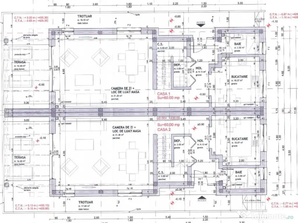 ID intern CA246113 Imobilul oferit spre vânzare este o casă tip duplex, situată într-o zonă liniștită și verde, aproape de VIVO MALL și mijloacele de transport. Casa are o suprafață utilă de 119 mp și un teren de 235 mp. Este construită din cărămidă, cu fundație din ciment și izolație exterioară, iar acoperișul este de tip terasă circulabilă. Casa este dispusă pe trei nivele: la parter se află un hol de intrare, o baie cu geam, un spațiu de depozitare, o bucătărie separată, un living generos cu acces pe terasă. La etajul 1 sunt un hol, un dormitor matrimonial cu dressing și baie proprie, două dormitoare și o baie; iar la etajul 2 se află o terasă circulabilă cu vedere panoramică deosebită. Imobilul beneficiază de dotări moderne, precum centrală proprie, feronerie din PVC cu feronerie triplu stratificat, feronerie de termopan, ușă PVC, gradină și acces auto în curte. Dacă această ofertă vă interesează sau doriți să consultați alte oferte, nu ezitați să ne contactați telefonic sau să veniți la sediul nostru din Str. Eroilor, Nr. 25, Ap. 15 (et. 1), Florești. Număr niveluri imobil: 3 Număr Băi: 3 Posibilitate parcare: Da Nr. locuri parcare: 2 Curent Apă Canalizare Gaz Încălzire