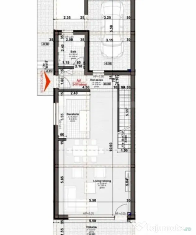 Parter: living spațios cu bucătărie tip open space, 1 baie, spatiu de depozitare si garaj