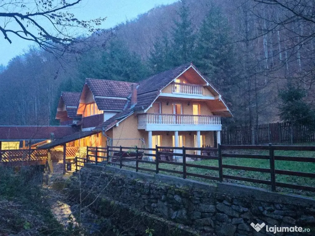 Va propunem spre vanzare o proprietate unica prin prisma locatiei cat si a functionalitatii acestui imobil, complexitatea ei in utilizare,pensiune formata din doua corpuri unite, parte a aceleasi proprietati dar cu CF-uri separate atat ca si constructie cat si ca teren pentru exploatare turistica functionala fiind pregatita pentru operare imediata, eventual cu investitii minime in functie de viziunea noului proprietar.