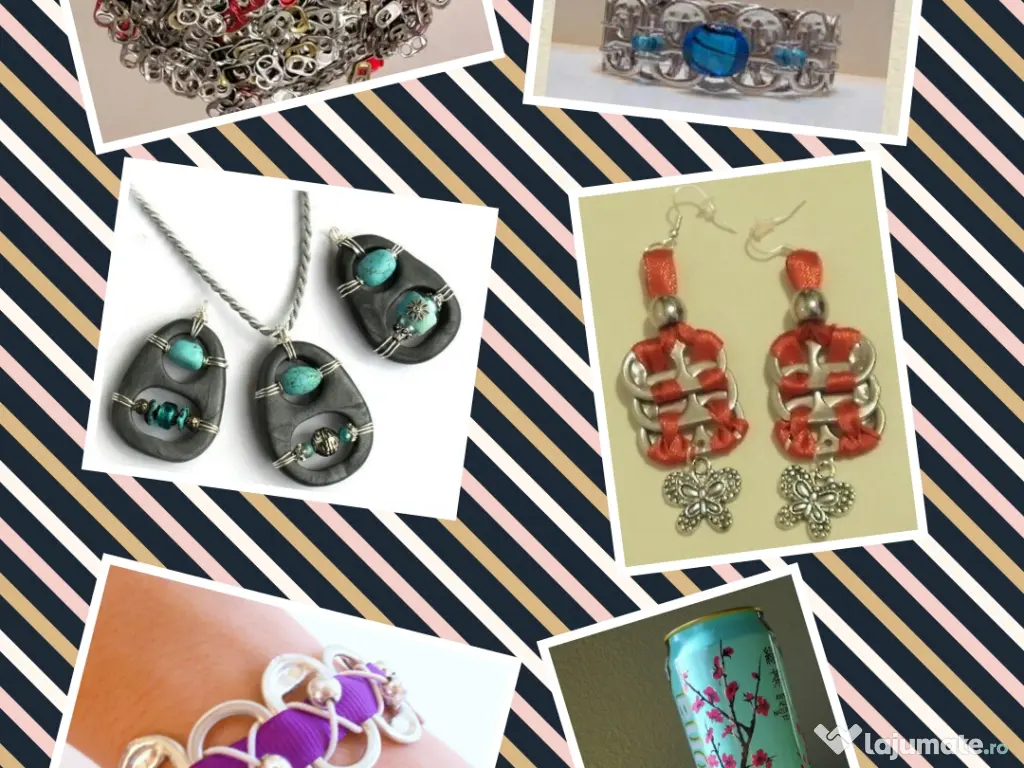 Cheite metal si aluminiu de la doze de bauturi si de la conserve de alimente diferite forme si culori pentru confectionarea de martisoare, bratari, cercei, inele, pandantive, ornamente, accesorii ori articole artizanale handmade formand diverse accesorii podoabe sau obiecte personale, ca cele cateva exemple ce se pot vedea in foto