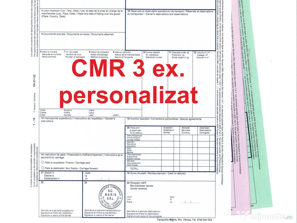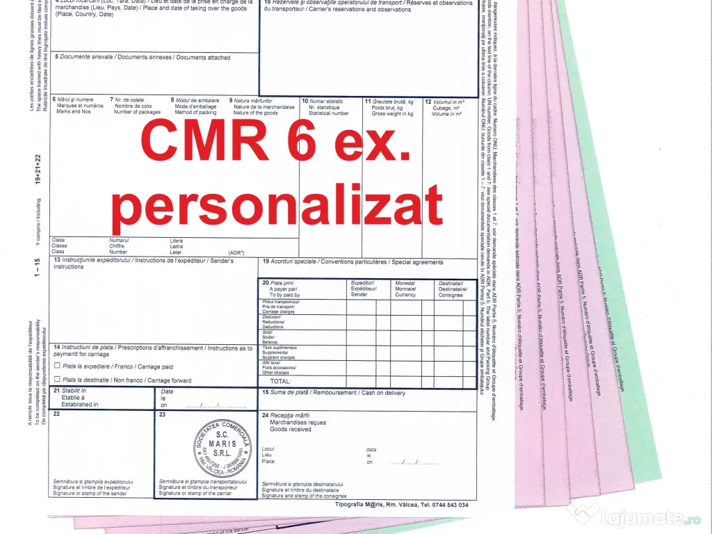Formular tipizat CMR-Scrisoare de transport-24 rubrici-pentru uz intern si international. Disponibil in 6 variante: 1. Romana–Franceza–Engleza. 2. Italiana–Engleza–Romana. 3. Romana–Germana. 4. Romana–Germana–Engleza. 5. Franceza–Engleza–Germana–Romana. 6. Scrisoare de transport–Romana. Format A4, tipar negru, 1 fata. Numar de exemplare/set: 2, 3, 4, 5 sau 6. 2 ex. CMR-uri, carnet A4, tipar negru, 1 fata, 100 file autocopiative (alb,verde) 50 seturi in 2 ex.-12,00 lei+TVA/carnet, adica 0,24 lei+TVA/setul de 2 ex. Pentru personalizare gratuita comanda minima este de 60 carnete (valoare totala 720 lei+TVA); 3 ex. CMR-uri, carnet A4, tipar negru, 1 fata, 150 file autocopiative (alb,roz,verde) 50 seturi in 3 ex.-18,00 lei+TVA/carnet, adica 0,36 lei+TVA/setul de 3 ex. Pentru personalizare gratuita comanda minima este de 40 carnete (valoare totala 720 lei+TVA); 4 ex. CMR-uri, carnet A4, tipar negru, 1 fata, 200 file autocopiative (alb,roz,roz,verde) 50 seturi in 4 ex.-24,00 lei+TVA/carnet, adica 0,48 lei+TVA/setul de 4 ex. Pentru personalizare gratuita comanda minima este de 30 carnete (valoare totala 720 lei+TVA); 5 ex. CMR-uri, carnet A4, tipar negru, 1 fata, 150 file autocopiative (alb,roz,roz,roz,verde) 30 seturi in 5 ex.-18,00 lei+TVA/carnet, adica 0,60 lei+TVA/setul de 5 ex. Pentru personalizare gratuita comanda minima este de 40 carnete (valoare totala 720 lei+TVA); 6 ex. CMR-uri, carnet A4, 1 tipar negru, 1 fata, 150 file autocopiative (alb,roz,roz,roz,roz,verde), 25 seturi in 6 ex.-18,00 lei+TVA/carnet, adica 0,72 lei+TVA/setul de 6 ex. Pentru personalizare gratuita comanda minima este de 40 carnete (valoare totala 720 lei+TVA); Pentru CMR-uri personalizate, la cantitatile minime prezentate mai sus-COST PERSONALIZARE=0 Pentru cantitati mai mici decat cele din oferta preturile difera fata de cele prezentate mai sus. Termen de livrare: MIN 2-MAX 7 zile lucratoare de la plata/incasarea facturii. In cazul in care sunteti interesat si doriti sa efectuati o comanda puteti sa ne contactati la nr. de telefon din anunt. Executia produselor se face dupa plata/incasarea facturii proforme. In cazul in care BENEFICIARUL opteaza pentru transportul produselor cu o firma de curierat, acesta va achita transportul.