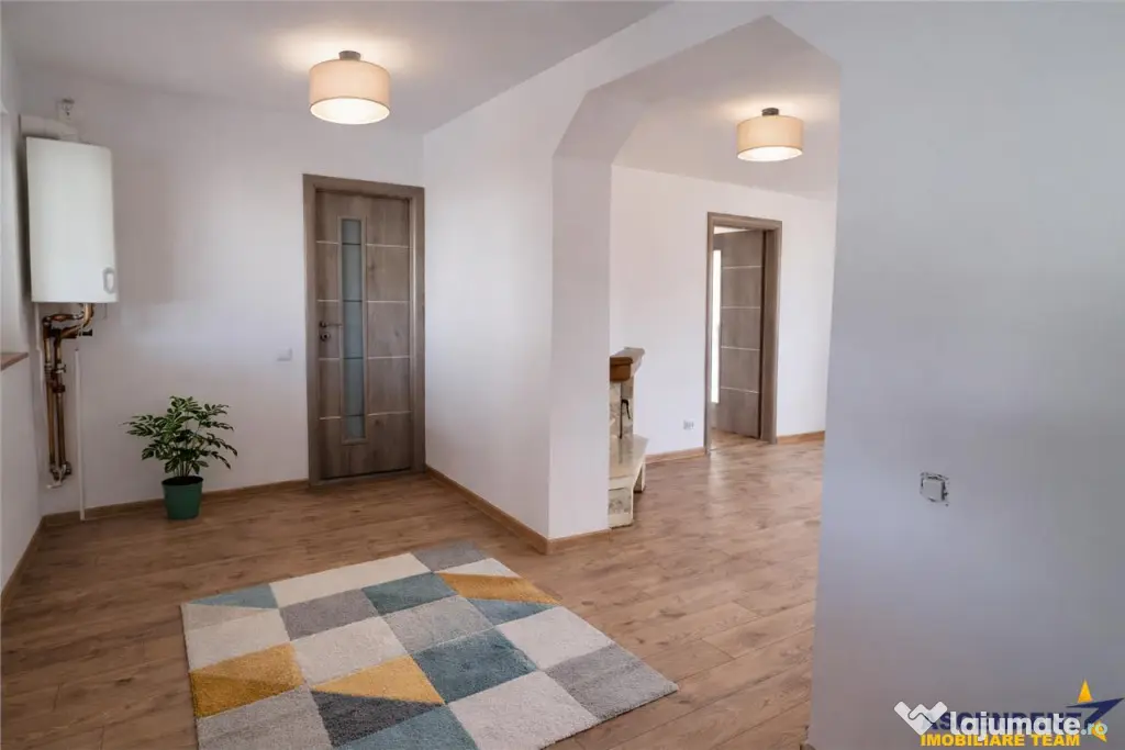 Prima este o casa cocheta ce se desfasoara pe living, dormitor, bucatarie, baie, hol, recent renovata, cu incalzire in pardoseala, semineu si finisaje de calitate, plus o terasa tip foisor cu gratar, pivnita si pod.