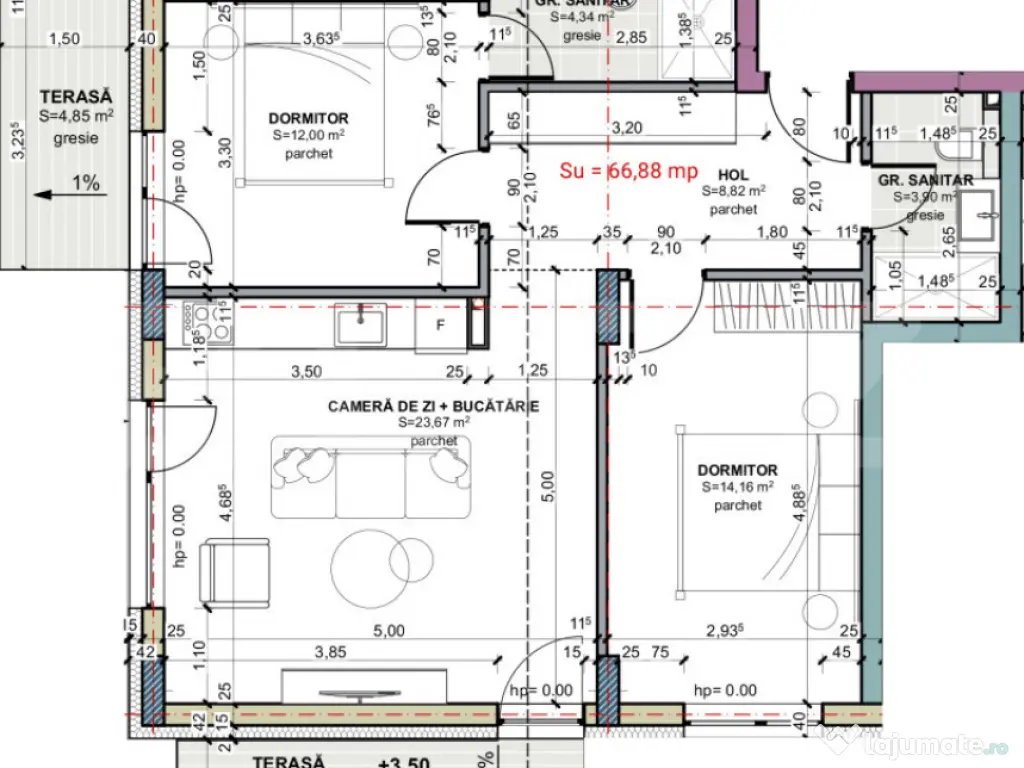 Blitz va prezinta un apartament cu 3 camere în Terra Gardens, Cluj-Napoca Locuințe moderne într-un ansamblu exclusivist cu acces privat, compus din case și blocuri cu regim redus de înălțime – o alegere ideală pentru familii sau investiție sigură. Parcări subterane disponibile (10.000 € TVA INCLUS) Plata se face conform LEGII NORDIS: - 5% la faza incipienta - 25% la finalizarea structurii - 20% la finalizarea instalatiilor - 50% la contractul final prin surse proprii sau credit ipotecar. Termen de finalizare: decembrie 2026 Exemplu disponibil – Etaj 1: • Suprafață utilă: 66,88 mp • 2 dormitoare, 2 băi • Living generos + bucatarie • 2 balcoane • Predare la stadiul de semifinisat – 2 mâini de glet, șapă, instalații trase pe poziții • Încălzire în pardoseală • Centrală termică smart pe bloc Cod ofertă / ID BLITZ: P156611 Id intern: P156611 Confort: 1 Tip imobil: Bloc de apartamente Număr Băi: 2