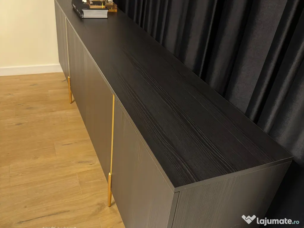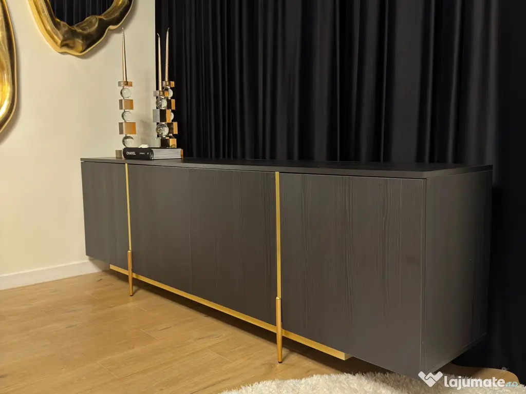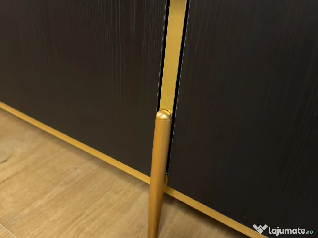 Vând comodă modernă pentru living, cu design elegant negru cu elemente aurii. Piesa este foarte spațioasă și se potrivește perfect într-un living sau dining.