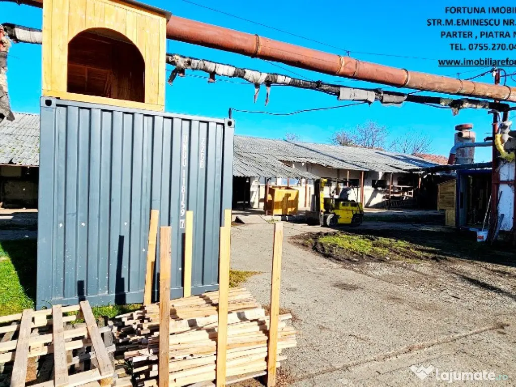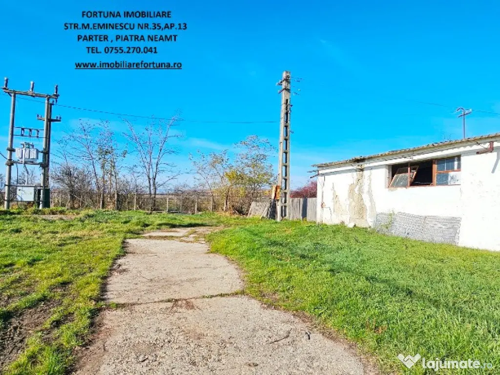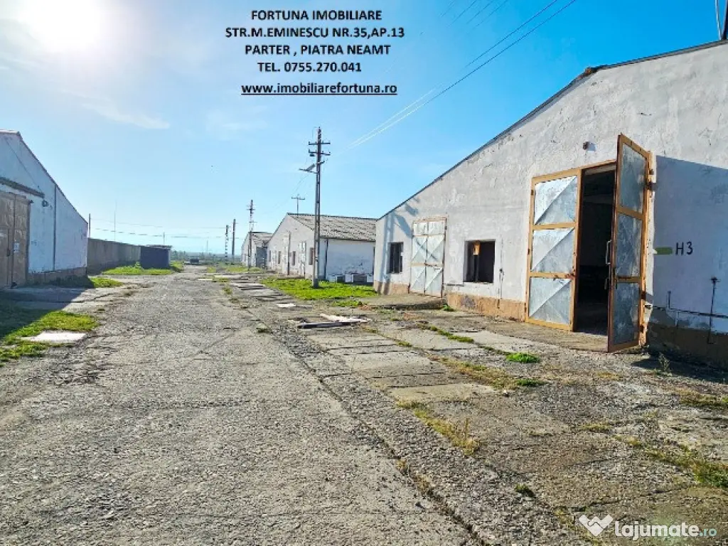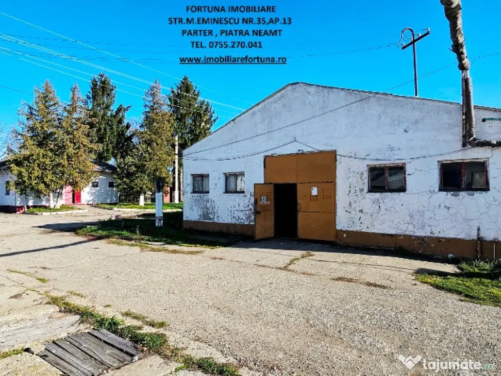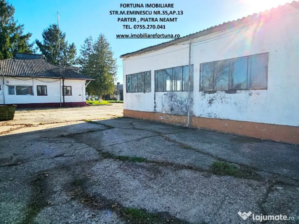 OPORTUNITATE DE AFACERE! COMPLEX IMOBILIAR FORMAT DIN CLADIRI ȘI CONSTRUCȚII INDUSTRIALE / EDILITARE CU SUPRAFAȚA DE 18.625 MP ȘI TEREN INTRAVILAN CU SUPRAFAȚA DE 50.718 MP, LA 6 KM DE MUN. PIATRA NEAMȚ, ZONĂ CU VALENȚĂ ECONOMICĂ / COMERCIALĂ 1.500.000 EURO NEG – POSIBILITATE VÂNZARE FRACȚIONATĂ Pentru persoanele fizice / juridice interesate de desfășurarea / extinderea unor activități economice/ de producție / valorificarea unor noi oportunități de business, FORTUNA IMOBILIARE oferă spre vânzare această proprietate imobiliara cu caracter industrial-logistic, multifuncțională și bine poziționată în apropiere de Piatra Neamț, într-o arie aflată în plin proces de dezvoltare economică, cu acces direct la drumuri de mare tonaj și cu conexiune rapidă la principalele rute regionale. Proprietatea este compusă din suprafața de 50.718 mp teren intravilan pe care se află un ansamblu de hale industriale, spații administrative, depozite și infrastructură tehnică, configurate pentru activități de producție, prelucrare, depozitare și logistică, în suprafață cumulată de 18.625 mp. 1. Descrierea construcțiilor: Hala 1 – în suprafață de 1.514 m² • Renovată interior (au fost pregătite birourile și anexele pentru un nou corp administrativ, prevăzut cu grupuri sanitare, săli de prezentare, spații pentru producție); • Pardoseli sclivisite, pereți reparați; • Uși batante industriale (mică și mare, destinata accesului vehiculelor de mare tonaj); • Spații producție, depozitare, prezentare; • Spațiu compartimentat pentru cantină (vestiare, dușuri, magazii, spații alimentare - depozitare veselă, magazii alimente, echipamente pentru gătit); • Acoperiș tip sandwich. Alte hale: • 4 hale similare, fiecare cu suprafața cuprinsă între 1.908 m² – 1.912 m², conectate prin platforme betonate cu lățime de 10 ml, între care se află stâlpi electrici pentru iluminat perimetral; • Hala 3 – funcțională, depozit semifabricate și produse finite; • Hala 4 – depozitare cherestea și utilaje; • Hala 5 – fostă hală zootehnică, structură conservată; • Hala 6 ~800 m², producție lemn (esență brad), pardoseală marmură, încălzire aer cald; • Hala 7 – finisaj lemn, dotată cu: sistem de exhaustare profesională; aer comprimat; instalații termice; pardoseli refăcute, ferestre termopan; • Hala 8 ~1.000 m², montaj și ambalare, având ca dotări: grupuri sociale, vestiare; 2 utilaje de tăiere cu laser; 2 compresoare aer; • Hala 9 – debitare bușteni, echipată cu; gater vertical + orizontal; stație de exhaustare a rumegușului și a prafului; centrală termică cu 2 cazane de 0,8 G (deservește 3 hale de productie + 2 clădiri); 2. Spații și facilități suplimentare: • Corp administrativ format din birouri, arhivă, grupuri sanitare; • Șarpantă depozitare: 800 m², H = 6 m (utilizabilă pentru uscarea cherestelei) • 2 foste silozuri: ~6.000 m² – pentru depozitare cherestea sau alte facilități; • 6 batale betonate: ~3.500 m², volum total ~10.000 mc (apă / piscicultură); • 4 uscătoare cherestea, capacitate 25 mc fiecare; • Platforme betonate ample, care asigură zone eficiente de manevră; • Spații tehnice, magazii, beci, fostă centrală termică; • Teren liber ~15.000 m² pentru construcții noi; 3. Utilități și infrastructură: • Energie electrică: • alimentare trifazată; • 2 posturi de transformare x 250 kVA (total 500 kVA); • Apă: • foraj propriu; • rezervor beton 150 mc; • stație hidrofor. • Canalizare: • fosă septică; • rețea internă; • Gaz metan: • conductă la limita proprietății (racordare facilă); • Siguranță incendiu: • rezervă apă; • hidrofor; • Iluminat perimetral și stâlpi electrici, pe întreaga proprietate; 4. Caracteristici urbanistice și potențial: • Zonă industrial–agricolă cu dezvoltare accelerată; • Topografie plană, favorabilă extinderilor; • Vizibilitate foarte bună; • Potențial ridicat pentru: • producție industrială; • logistică și depozitare; • parc industrial; • reconversii funcționale; • activități agricole și servicii conexe; Proprietatea reprezintă un ansamblu industrial complet funcțional, cu infrastructură tehnică solidă, acces excelent, suprafețe mari construite și teren disponibil pentru extindere. Poziționarea strategică între centrul administrativ și economic al Municipiului Piatra Neamț și platforma industrială Săvinești o face extrem de atractivă pentru investitori, operatori industriali sau dezvoltatori de parcuri logistice. Preț: 1.500.000 euro pentru întreg ansamblul imobiliar În funcție de specificul activității și anvergura afacerii d-voastră, construcțiile pot fi vândute separat. Pentru o prezentare detaliată a acestei oferte, furnizarea unor informații suplimentare referitoare la situația juridică / identificarea proprietății și programarea unei vizionări, vă invităm la sediul nostru, Fortuna Imobiliare, situat pe str. M. Eminescu, nr. 35, ap. 13, parter, lângă fostul Tribunal, tel. contact 0755.270.041. Your comfort is our priority ! Oferta noastră completă o găsiți aici: https://imobiliarefortuna.ro/ Suprafaţă totală: 18625 m² Suprafaţă birouri: 117 m² An finalizare construcție: 1982 Stadiu construcţie: Finalizat Tip imobil: Producţie/Servicii