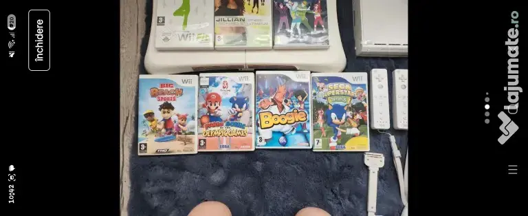 Cabluri: Alimentator original, cablu video AV și Sensor Bar.Toate jocurile sunt adecvate pentru copii (clasificare PEGI 3 și PEGI 7), fiind titluri de sport, dans și fitness, ideale pentru activitate în familie.Negociabil!