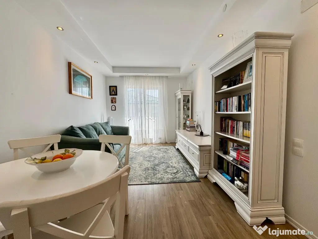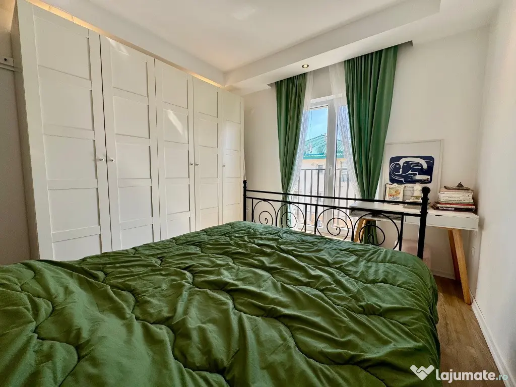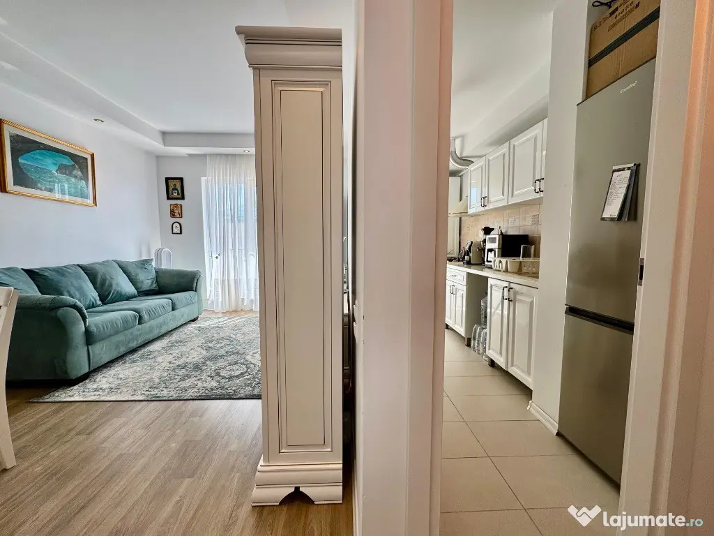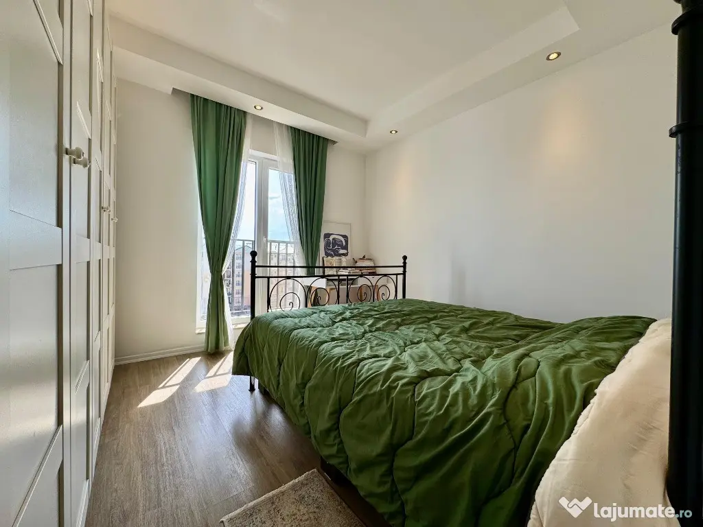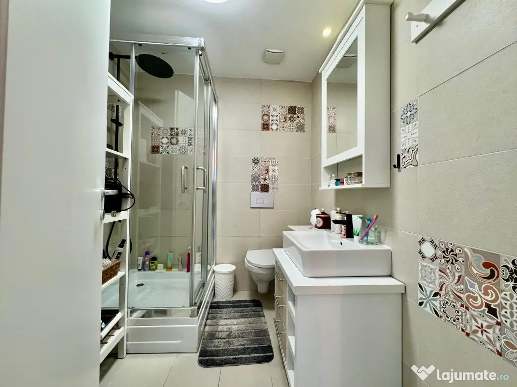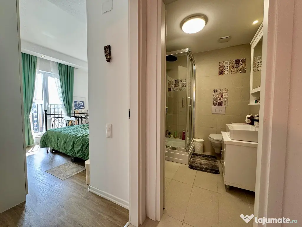 Va propunem spre vanzare un apartament de 2 camere tip studio, mobilat si utilat, in Complexul Rezidential Cosmopolis. Blocul este finalizat in anul 2019, constructia fiind din caramida porotherm de 30 cm si izolatie de 10 cm. Apartamentul are centrala proprie si incalzire in pardoseala. Se afla la etajul 6/6 (acoperis oblic), are o suprafata de 43 mp utili plus 5 mp balcon. Se vinde mobilat si utilat insa fara masuta suspendata de pe hol, lampa verticala din living, noptierele de langa pat si purificatorul de aer. Centrala a fost schimbata de curand, iar mobilierul este in mare parte Mobexpert.. Are orientare spre Sud-Est, oferind o superba priveliste spre piscina si zona de vile. Blocul in care se afla, este foarte bine pozitionat, fiind aproape de statia de autobuz si zona comerciala. Cartierului Rezidential Cosmopolis este pozitionat in partea de Nord a Bucurestiului avand acces facil catre zona de birouri Pipera, principalele zone de distractie si cumparaturi din Nord (Baneasa Shopping City, Promenada Mall, Gradina Zoo, Divertiland, Therme, etc.) si iesirile principale din Bucuresti catre munte si mare (A2 si A3). Este la 800 m de Autostrada Bucuresti-Ploiesti si intre cele doua poduri Pipera-Tunari si Andronache-Stefanestii de Jos. Locuinta beneficiaza de facilitatile complexului: Retail Park Cosmopolis Plaza cu peste 70 de magazine si 400 de locuri de parcare (retailer de top Jysk, C&A, Pepco, Tedi, Animax, Sinsay, Kik, Noriel, dar si branduri nationale bine-cunoscute Dr. Max, Domino's Pizza, Shaormeria Baneasa, Spartan, Magazin de produse traditionale, etc.) Supermarket-uri Lidl si Carrefour Supermecato Italia Restaurante si cafenele Sala de Fitness - WorldClass Terenuri de sport (1 teren fotbal, 2 terenuri de tenis) Peste 60 de piscine exterioare 2 gradinite (private), 1 scoala (privata), 1 scoala de stat in 4 parcuri (unul de aprox. 4000mp), 4 locuri de joaca pentru copii Centru medical Affidea Biserica ortodoxa si moschee Paza BGS 24/24 Transport asigurat pana la metrou Pipera Birou impozite si taxe locale Spalatorie auto si service auto, etc. Locuinta are toate documentele necesare pentru vanzare. Pentru detalii si vizionari, va stam la dispozitie. Confort: 1 Tip imobil: Bloc de apartamente