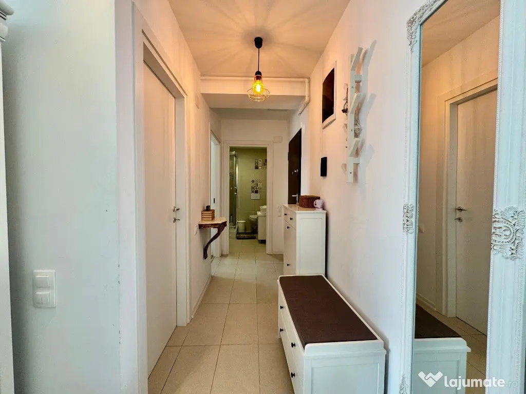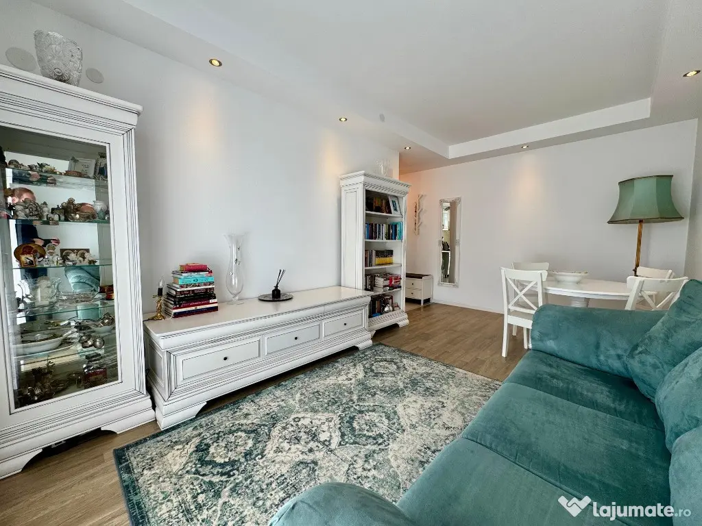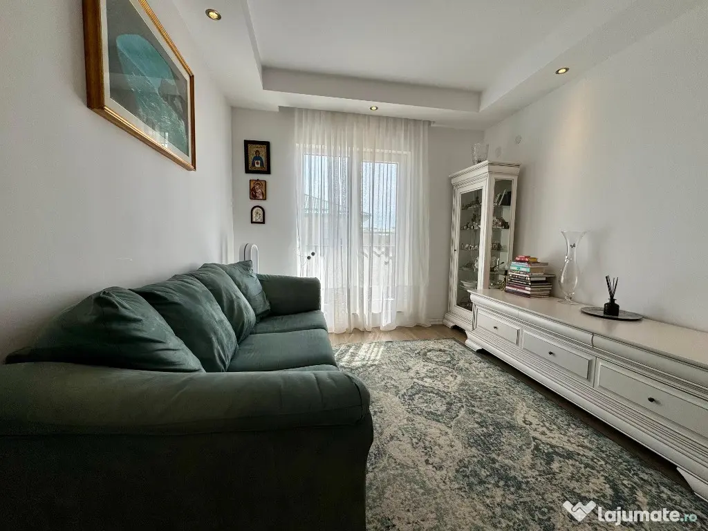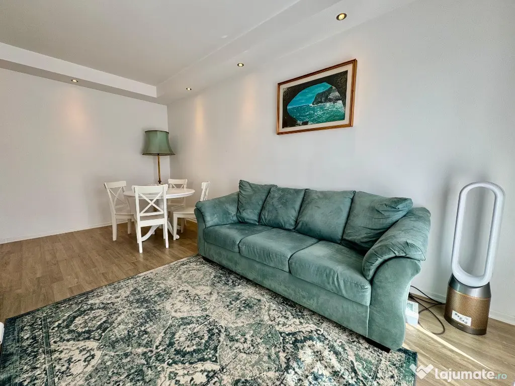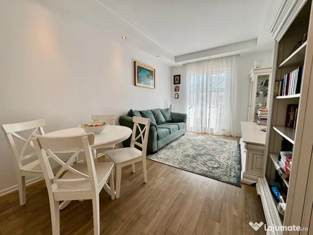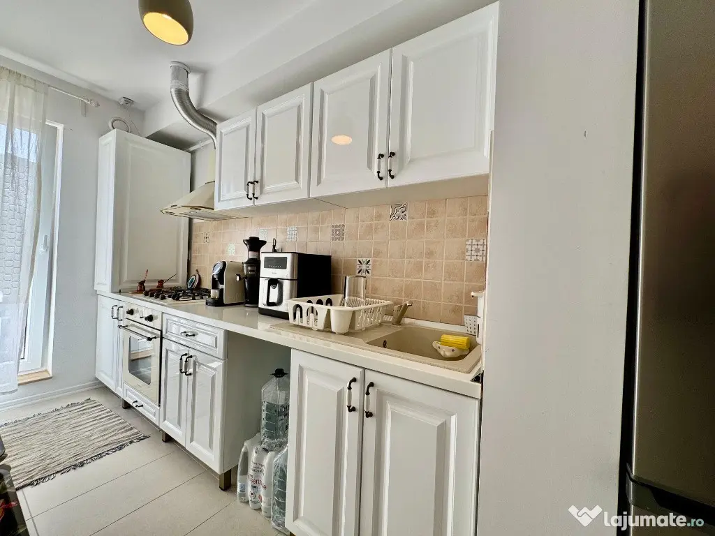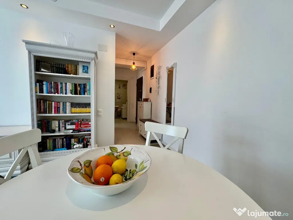 Va propunem spre vanzare un apartament de 2 camere tip studio, mobilat si utilat, in Complexul Rezidential Cosmopolis. Blocul este finalizat in anul 2019, constructia fiind din caramida porotherm de 30 cm si izolatie de 10 cm. Apartamentul are centrala proprie si incalzire in pardoseala. Se afla la etajul 6/6 (acoperis oblic), are o suprafata de 43 mp utili plus 5 mp balcon. Se vinde mobilat si utilat insa fara masuta suspendata de pe hol, lampa verticala din living, noptierele de langa pat si purificatorul de aer. Centrala a fost schimbata de curand, iar mobilierul este in mare parte Mobexpert.. Are orientare spre Sud-Est, oferind o superba priveliste spre piscina si zona de vile. Blocul in care se afla, este foarte bine pozitionat, fiind aproape de statia de autobuz si zona comerciala. Cartierului Rezidential Cosmopolis este pozitionat in partea de Nord a Bucurestiului avand acces facil catre zona de birouri Pipera, principalele zone de distractie si cumparaturi din Nord (Baneasa Shopping City, Promenada Mall, Gradina Zoo, Divertiland, Therme, etc.) si iesirile principale din Bucuresti catre munte si mare (A2 si A3). Este la 800 m de Autostrada Bucuresti-Ploiesti si intre cele doua poduri Pipera-Tunari si Andronache-Stefanestii de Jos. Locuinta beneficiaza de facilitatile complexului: Retail Park Cosmopolis Plaza cu peste 70 de magazine si 400 de locuri de parcare (retailer de top Jysk, C&A, Pepco, Tedi, Animax, Sinsay, Kik, Noriel, dar si branduri nationale bine-cunoscute Dr. Max, Domino's Pizza, Shaormeria Baneasa, Spartan, Magazin de produse traditionale, etc.) Supermarket-uri Lidl si Carrefour Supermecato Italia Restaurante si cafenele Sala de Fitness - WorldClass Terenuri de sport (1 teren fotbal, 2 terenuri de tenis) Peste 60 de piscine exterioare 2 gradinite (private), 1 scoala (privata), 1 scoala de stat in 4 parcuri (unul de aprox. 4000mp), 4 locuri de joaca pentru copii Centru medical Affidea Biserica ortodoxa si moschee Paza BGS 24/24 Transport asigurat pana la metrou Pipera Birou impozite si taxe locale Spalatorie auto si service auto, etc. Locuinta are toate documentele necesare pentru vanzare. Pentru detalii si vizionari, va stam la dispozitie. Confort: 1 Tip imobil: Bloc de apartamente