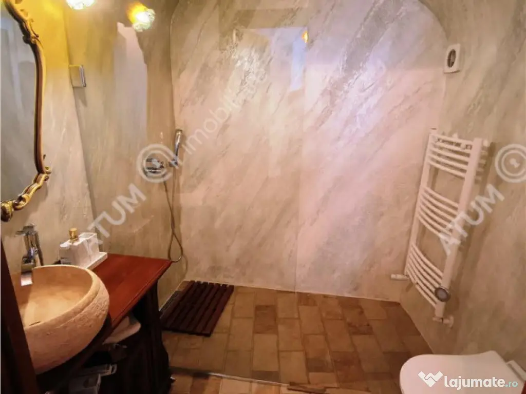 Descopera farmecul Sibiului direct din inima orasului! ATUM Imobiliare va propune spre inchiriere un apartament unicat, compus din 2 camere, situat langa Piata Mare din Sibiu. Apartamentul este situat la parterul unei case solide, fara igrasie, spatiul util de 44 mp este foarte luminos, primitor si ideal pentru cei care apreciaza atmosfera boema a centrului, cu acces la pas spre cele mai frumoase stradute, restaurante, cafenele, terase, magazine, parcuri si locuri de joaca publice, scoli, facultati, obiective turistice, statii de autobuz/taxi etc. Proprietatea prezinta o atmosfera burgheza fiind renovata in totalitate, printre dotari si imbunatatiri amintim de: instalatii electrice si sanitare noi, pereti refacuti in totalitate de la caramida (tencuiala, tinci si vopsea lavabila), usi din lemn la interior, geamuri termopan cu tamplarie din lemn prevazute cu obloane exterioare, parchet reconditionat din lemn masiv, gresie, faianta, centrala termica proprie pe curent, boiler, calorifere, mobilier de calitate in toate incaperile si electrocasnice noi (frigider, masina de spalat rufe, uscator rufe, cuptor cu microunde, masina de spalat vase, plita pe inductie, cuptor si hota electrice). Aceasta proprietate este situata la doar cativa pasi de Piata Mare a orasului, imbina eleganta clasica a cladirilor vechi cu confortul modern, fiind renovata in totalitate, cu materiale de calitate si finisaje atent alese. Pretul de inchiriere este de 499 euro/luna garantie. ID intern: 3015. Confort: 1 Tip imobil: Casă/Vilă Număr Băi: 1