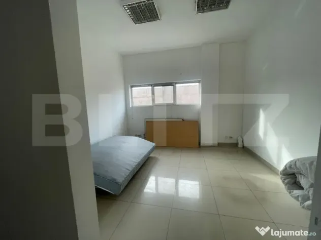 Birouri amenajate la intrare, pe ambele laturi: 3 birouri, o baie cu toaletă și duș, plus un office pentru pauzele de masă.
