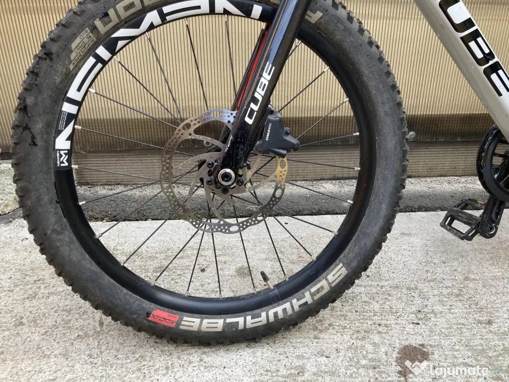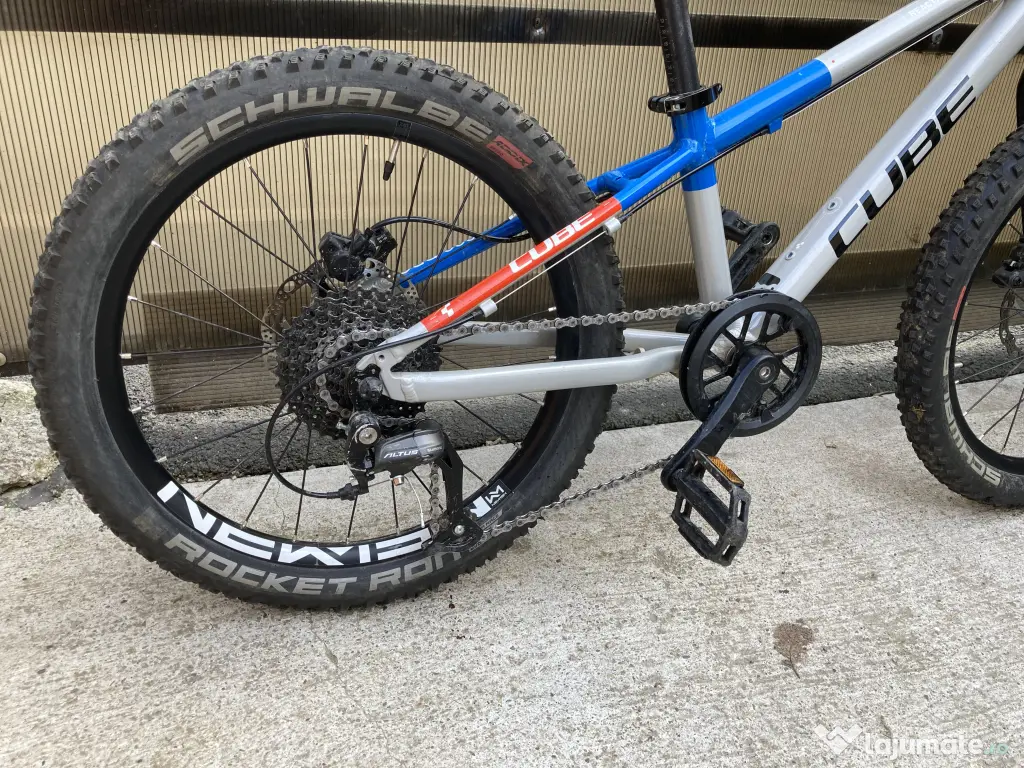 Roti 20', furca din fibra de carbon, frane hidraulice Tektro HD-M275, schimbator Shimano Altus 9 viteze, cauciucuri Schwalbe Rocket Ron 2.25", toate piesele originale, greutate 7,9 Kg.