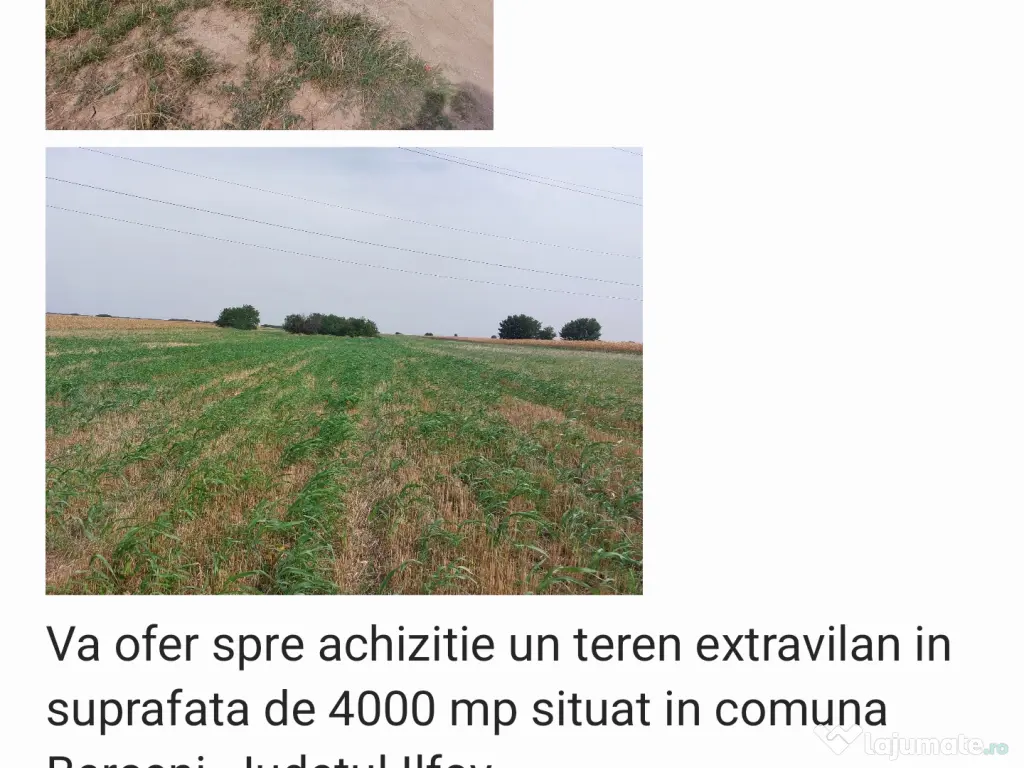 Ofer spre vânzare sau închiriere teren extravilan în suprafață de 4000 mp, situat în comuna Berceni, județul Ilfov.