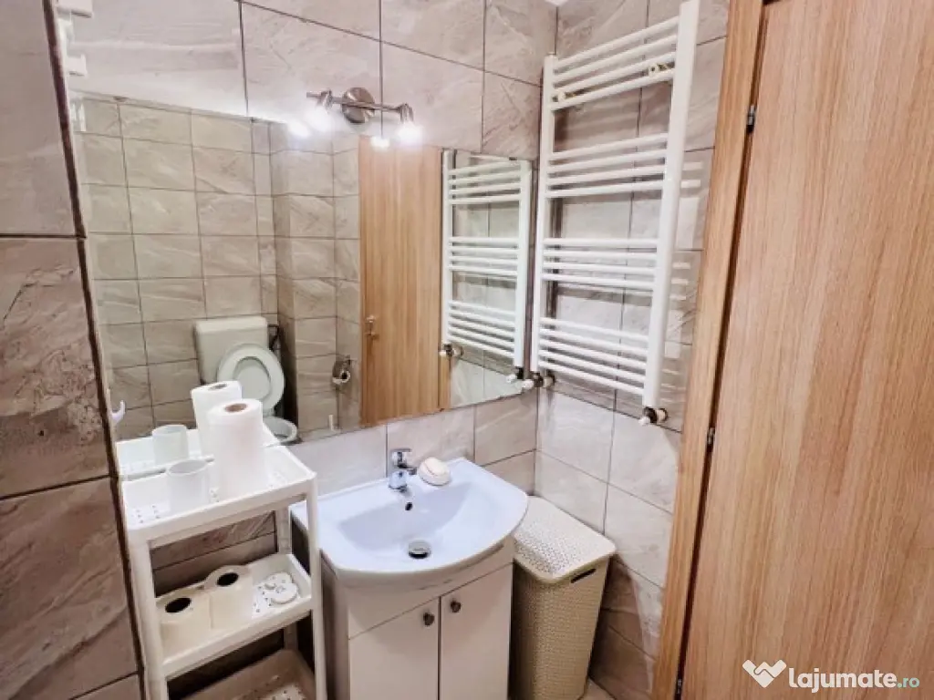 Această garsonieră de închiriat are 43 mp și este recent construită, după 2000. Are compartimentare decomandată, fiind ideală pentru confort. Finisajele sunt de înaltă calitate, iar luminile naturale pătrund prin ferestre mari. Camera are vedere către stradă, iar baia și bucătăria sunt complet utilate. Apartamentul se află la etajul 3, într-un imobil cu finisaje moderne. Locația este foarte avantajoasă, în zonă urbană, aproape de centre educaționale și medicale. La o distanță mică găsești grădinițe, școli și universități. În plus, sunt multiple parcuri și spații verzi în apropiere pentru relaxare. Transportul în comun este bine dezvoltat, cu stații de autobuz și metrou aproape. Profită acum de această oportunitate și programează o vizionare pentru a descoperi tot ce are de oferit acest apartament! Confort: 1 Tip imobil: Bloc de apartamente Comision cumpărător: 50%