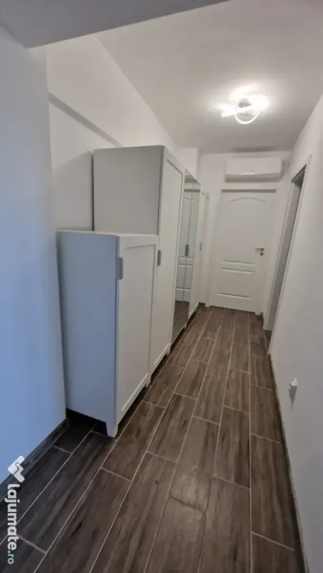 Apartamentul este mobilat complet(coltar extensibil, pat tapitat 163 * 215 cm, cu saltea 160 * 200 si tablie inalta 155, mobila living, dressing hol, comode dormitor, mobila bucatarie inclusiv chiuveta cu baterie, masa cu scaune, etc.