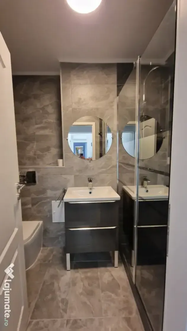 In bai se regasesc: cadita dus 140*70 cm, paravan dus 125*195 cm, baterie dus termostatata(2 capete dus: unul fix, unul mobil), mobilier baie cu chiuveta si baterie, oglinda rotunda, vas WC stativ, rezervor WC incastrat cu clapeta actionare, accesorii baie( suporturi prosoape, etc.).