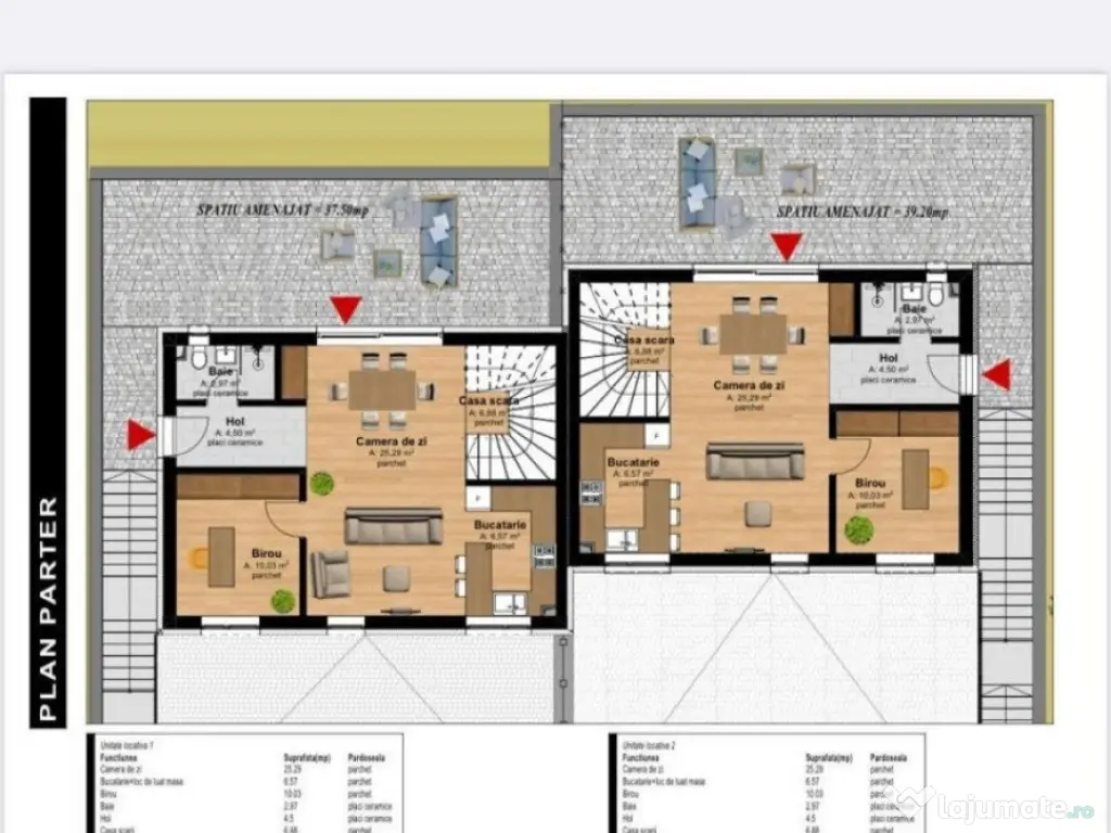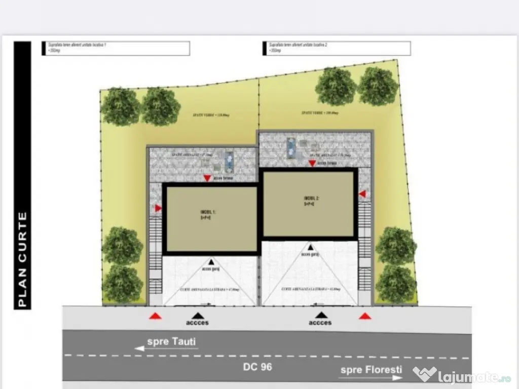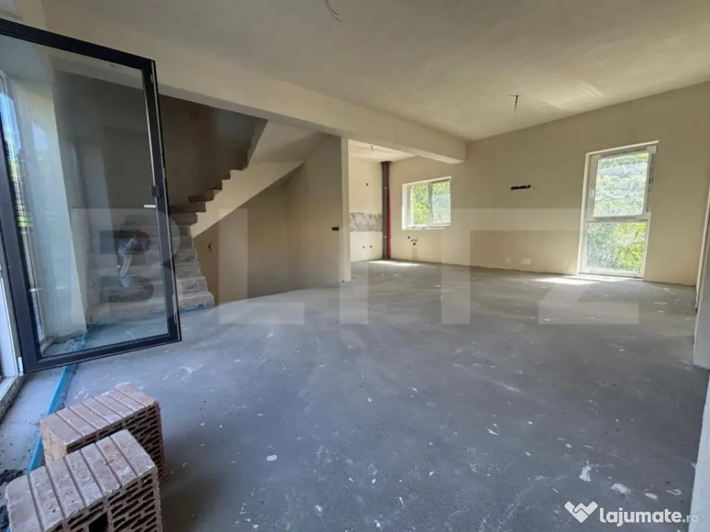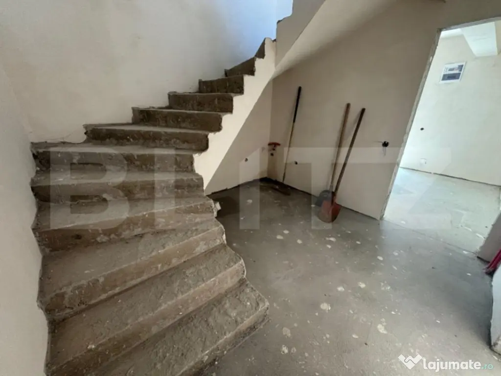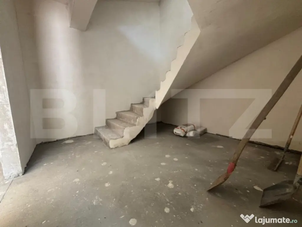Blitz ofera spre vanzare un duplex pozitionat apropare de padure, in Tauti. Zona una este extrem de linistita, aproape de natura. Situat pe o strada principal, accesul este facil catre Cluj-Napoca fiind foarte aproape de centura ocolitoare Floresti. Casele au un regim de inaltime D+P+E si este compartimentat astfel: Demisol - garaj pentru doua masini, spatiu tehnic , casa scarii - suprafata utila de 57 mp Parter - hol, baie, birou, bucatarie + camera de zi si casa scarii - suprafata utila de 56 mp Etaj - doua dormitoare, doua bai , dressing si un balcon - suprafata utila de 48 mp Suprafata utila a unei unitati locative este de 161 mp si teren aferent de 350 mp. Finalizare imobil martie - aprilie 2024. Fiecare unitate locativă se preda la stadiul de semifinisat cu următoarele: pereți gletuiți, instalații sanitare si electrice la poziție, centrala termică cu incalzire prin pardoseala, ferestre termoizolante, ușa intrare, sape autonivelante, curte amenajată si împrejmuită. Cod ofertă / ID BLITZ: P93698 Id intern: P93698 Număr niveluri imobil: 1 Număr Băi: 3 Nr. locuri parcare: 2